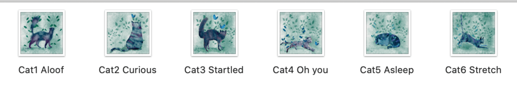 Our new cat, a tabby-tortiseshell, is Itty Bitty, because she was so small and cute as a kitten. She has, however, an attitude, a tortitide that prevents her from being the kind of cuddly, purry cat we expected when we adopted her. Sigh, so I painted this series in wishful thinking about the cute, cuddly kitten I thought I was getting. 🙂