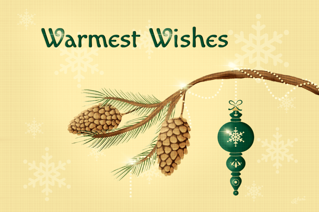 The pine tree and pine cone are parts of a previous work of art, to which I added the snowflake background and a vintage ornament. The pearls are a string of dots, as a brush, that I applied to create a look like it wrapped around the branch. So I needed to create a layer above the pine and a layer below the pine for the pearls. I also added shading and shadows as well as highlights.