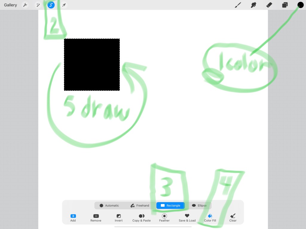 Or– with Procreate 5x: Choose your color. Choose Select. Choose Rectangle. Choose Color Fill. Draw your square and it will fill in automatically.