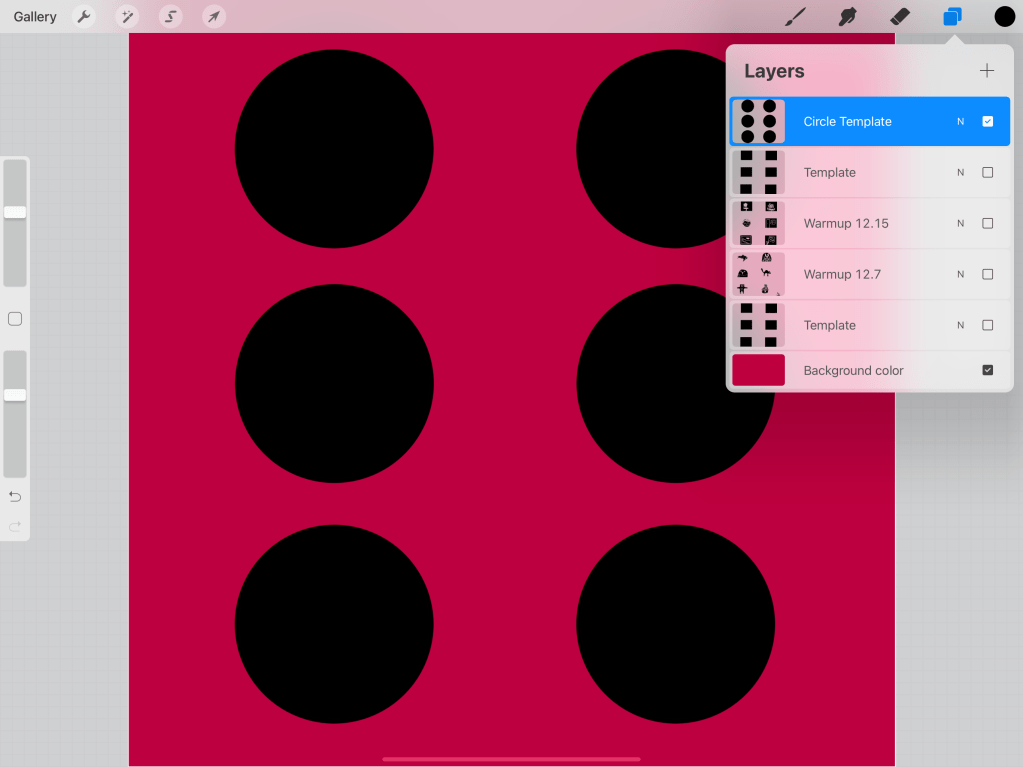 As you can see from my layers, I create a template for both squares and circles. To create the template, draw in one square.  Duplicate it and transform it next to the original.  Merge those two layers. Duplicate and transform that layer twice to create the six square template. Merge to one layer. Label it as “template.” Each time you want a warm up, just duplicate the template and hide the other layers.