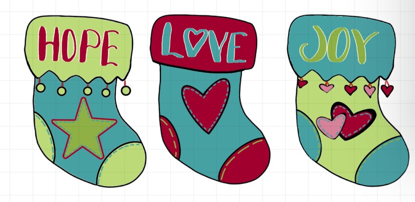 A few days ago I added to my challenge: stocking ornaments hung on a coat rack on the wall. I love the message and the colors, so bright and cheerful, complete with dangling hearts and stars. We no longer hang stockings, since it’s just Scott and I at home now, so illustrating these brought back memories and great feelings of joyous days of years ago. Art does that: it centers you and brings you to what matters most.