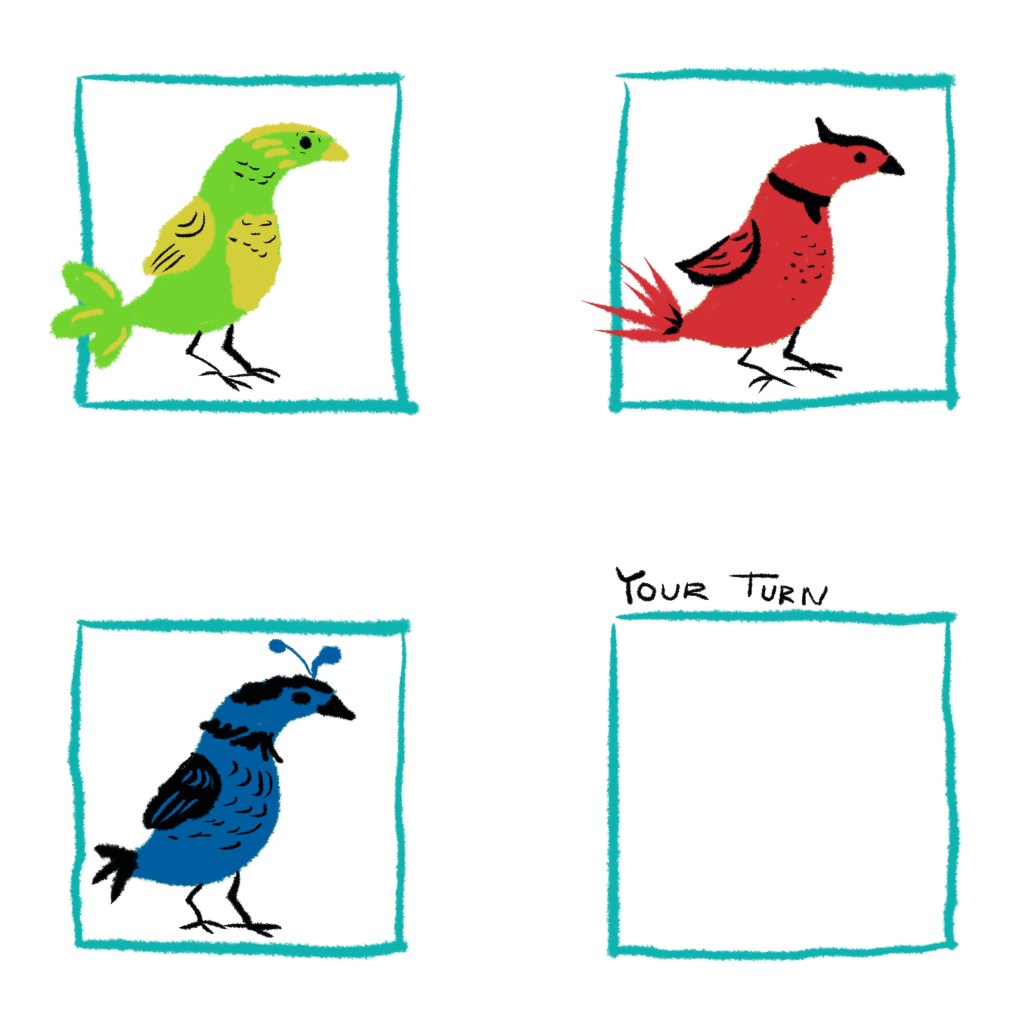 In winter, I look and listen for the birds as I miss their spring songs and hope their migrations or winter homes are safe. So, today’s Art For You is an adaptation of this week’s Wednesday Warm Up— Quick Birds. Once you start practicing the basic shape, you’ll be able to quickly draw and fill a fun bird, and then adapt it as shown in the Warm Up post.