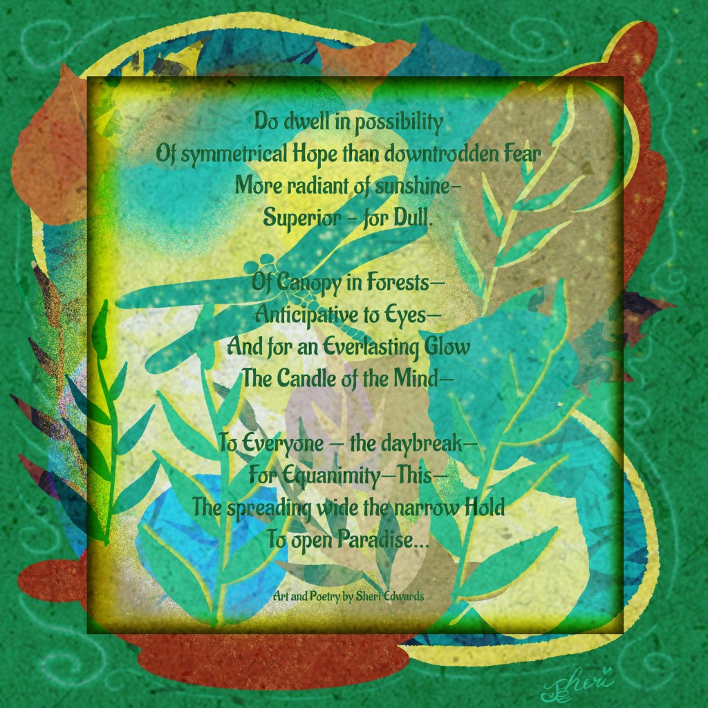 I had just created an attempt at abstract art yesterday, so I revised that picture to include a forest green to fit the poem I wrote based on “I dwell in Possibility” by Emily Dickinson. We’ve been watching the series on TV, enjoying each episode and poetry, so the strings of thought and metaphor written by Emily Dickinson seemed a good model for today’s DC.
