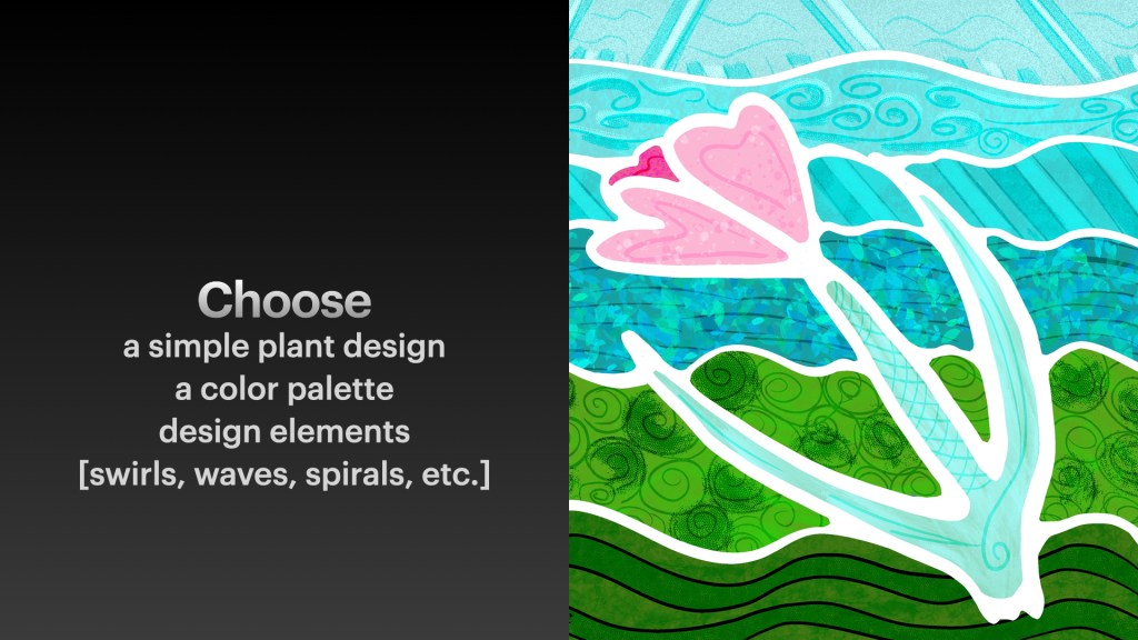 Be sure to choose your palette, a large plant or object to simplify as the focus, and possible filler designs.