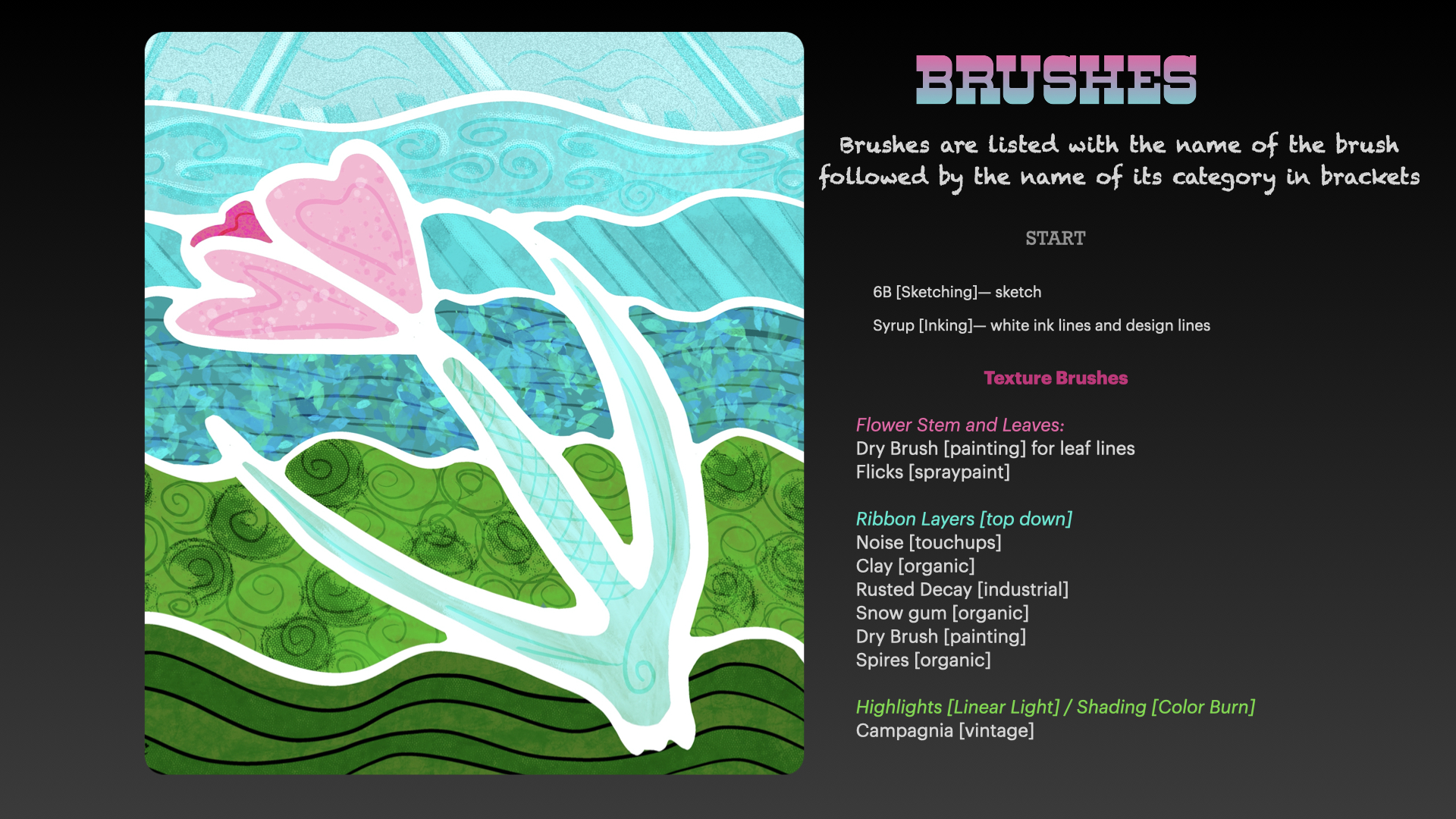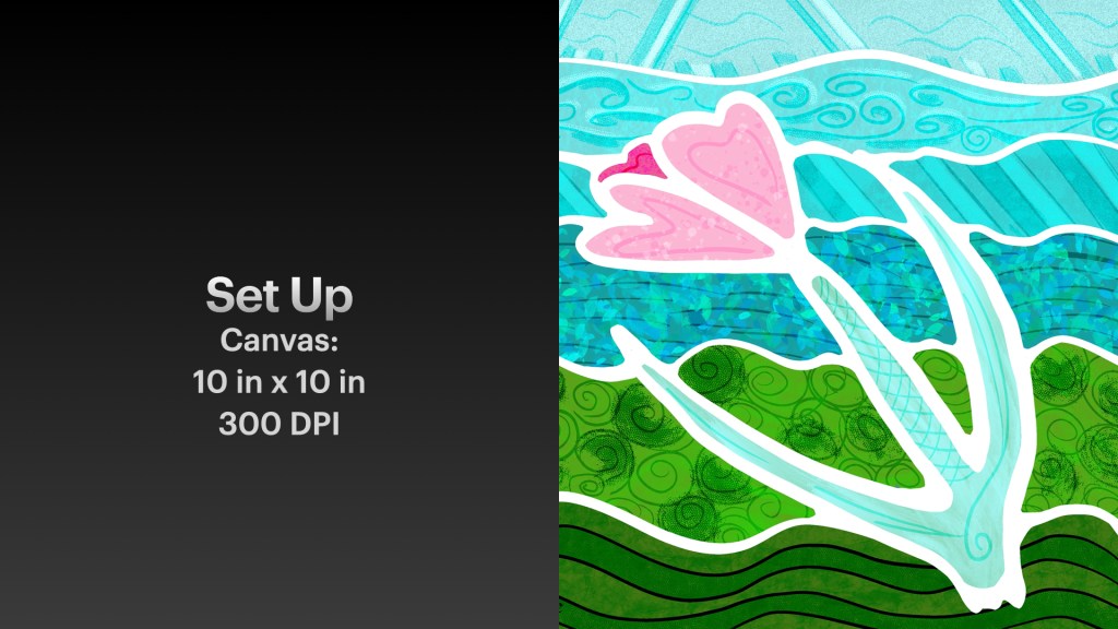 This warm up is so fun, and I thank Jennifer Nichols for her Skillshare class for teaching me the process. I’ve been creating quick doodles and small pieces and fun ones just because it is so soothing and the result so pleasing. It’s great practice for the selection tool from a reference layer, textures, blend modes, and line drawing. Plus, you get to practice brushes in action that you may not have tried yet!