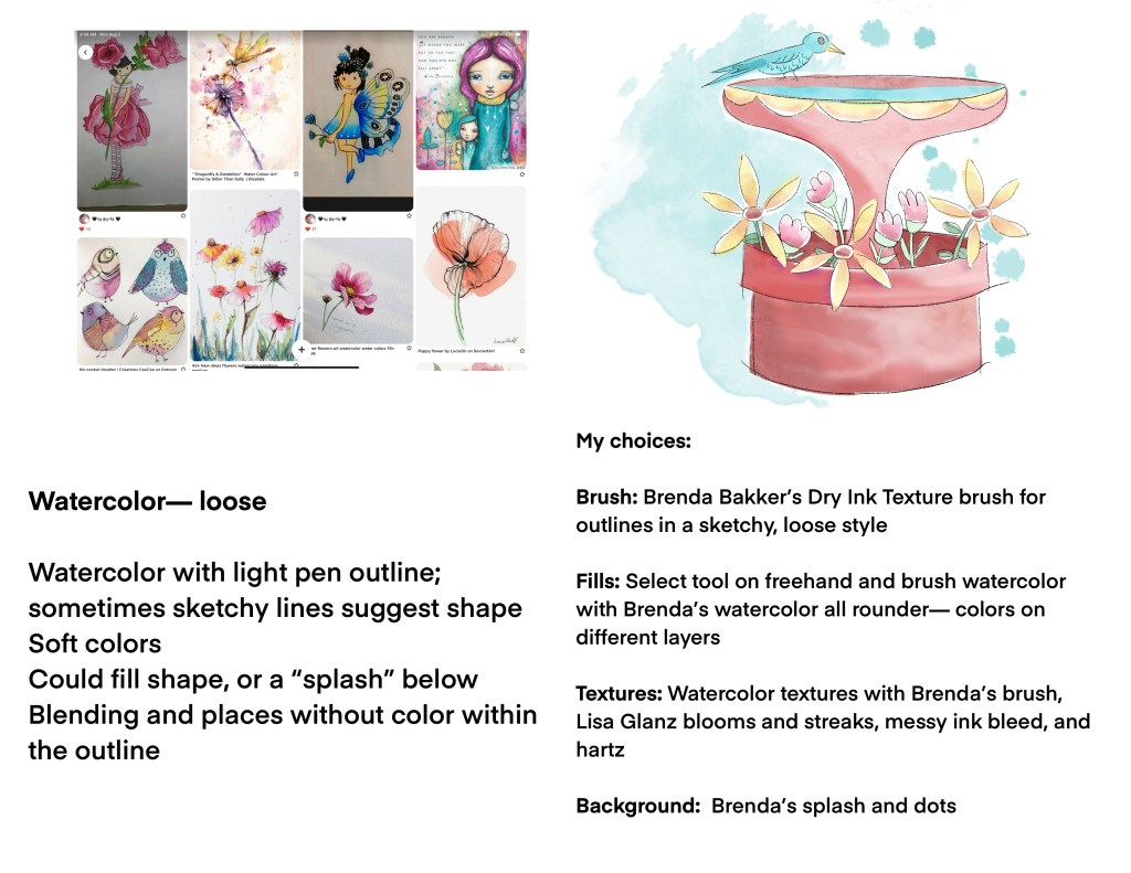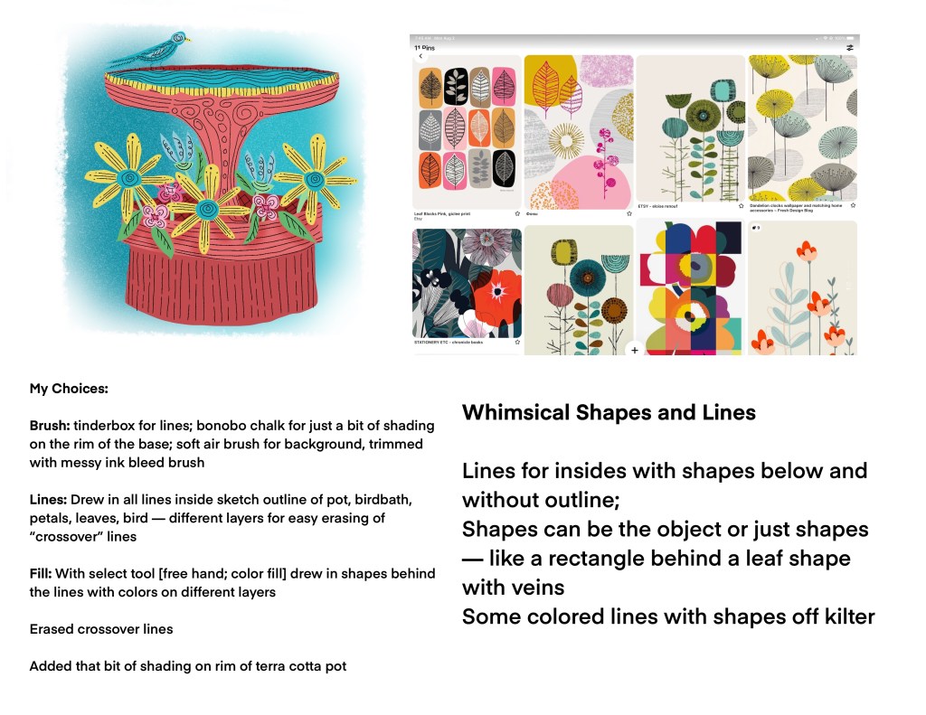 This has been a great way to change up the day and my art time– and stretch my learning to try some new styles. I took my time to search and organize styles I like, mostly for fun and whimsey. I analyzed them for the “how” and then made choices for my own attempts at each style. I spent a bit of time over a few days to choose, analyze, learn, and challenge myself to try a style.