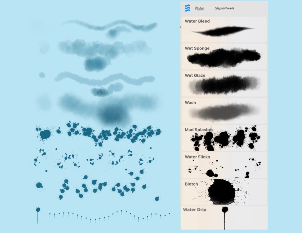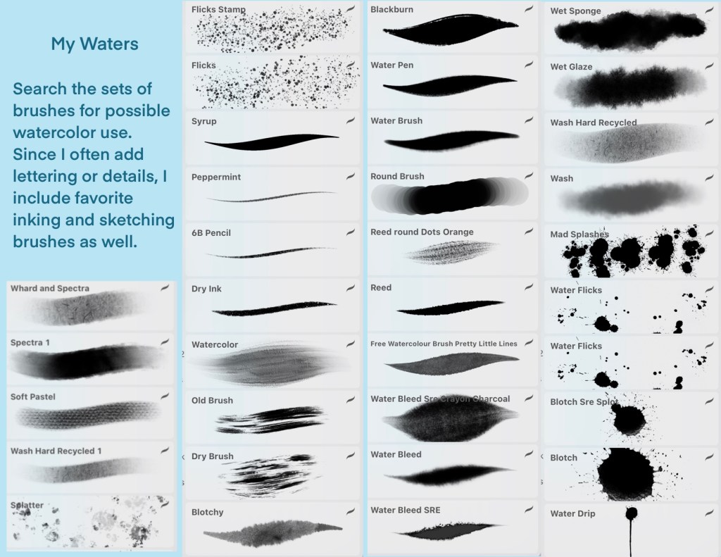 Use any watercolor brush that works for you. Here is a list of the watercolor category of brushes in Procreate, although there are more watercolor related brushes in other categories. It’s a good ideas to duplicate them and put them together in your own brush set. The second image shows the brush set I created called “My Waters” by duplicating those brushes I apply to my watercolors when using only native brushes.