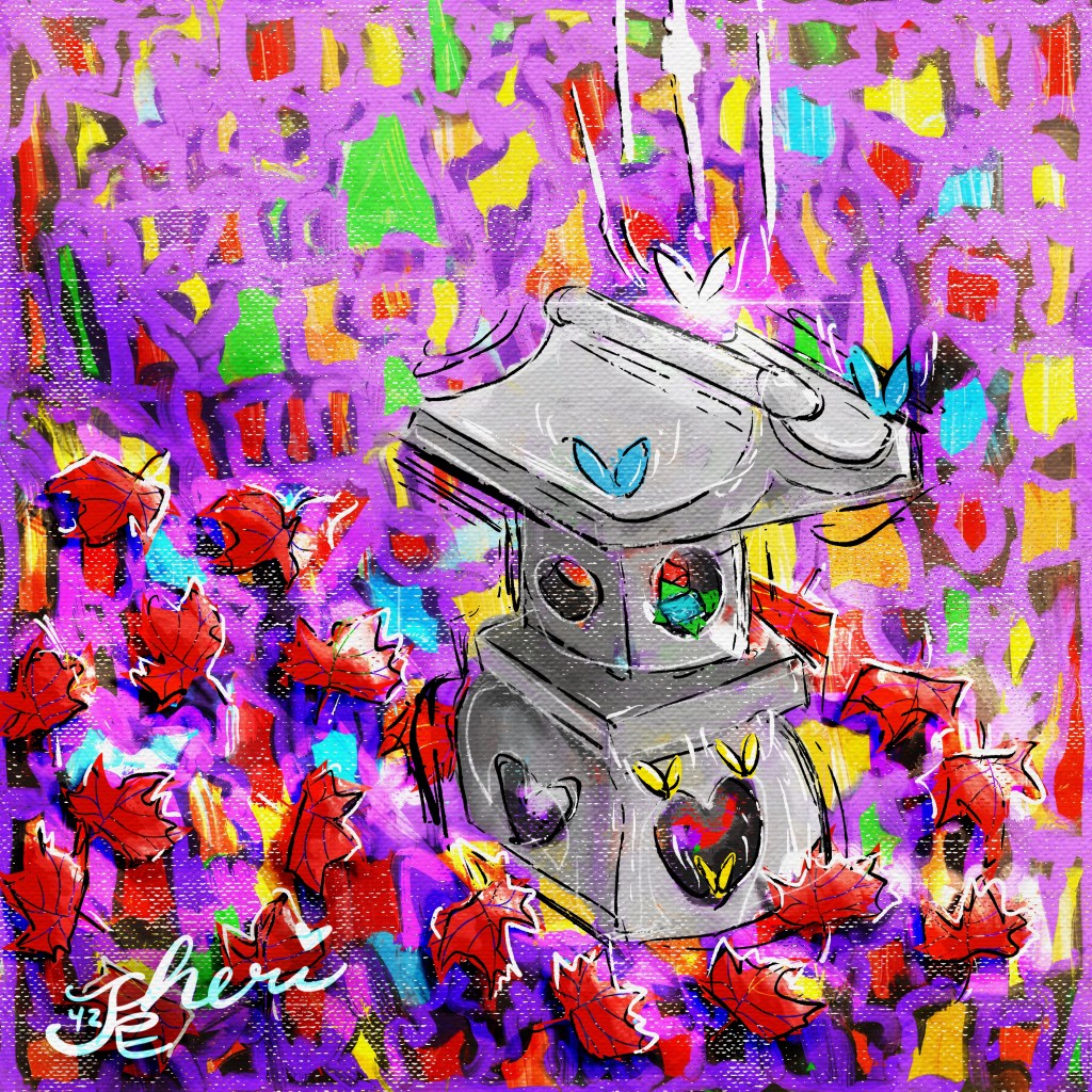 The blues, the white, the yellow pixies all swirled into the circle of red maples and the little meadow within, stopping on the little statue. The white landed on its top. The blues took the edges of the triangular roof, and the yellows— each took a side and the bottom of the heart shape of the lower part of the statue.