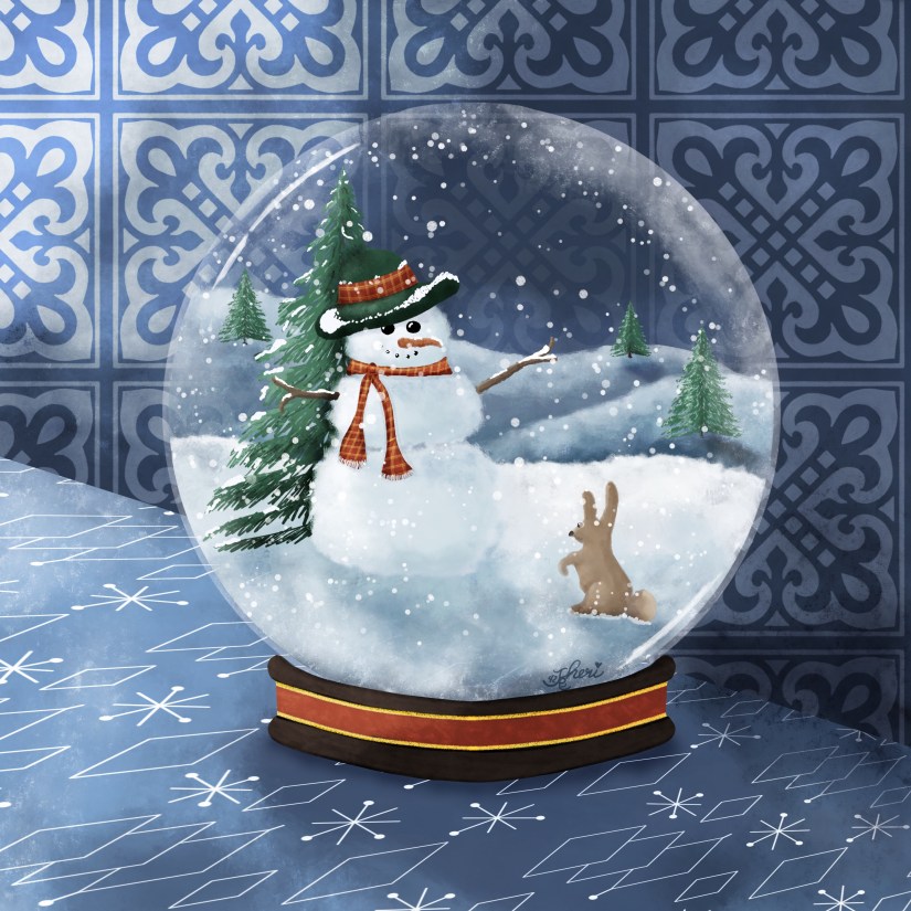 An example is the snow globe at the top of this post. I followed her instagram tutorial, and you can too here: Snow Globe How To . I adapted it to a snow globe sitting on a table. If you join her newsletter, you’ll receive access to her Procreate brush library. In the background of the image above and on the table, you’ll see two of her pattern brushes.