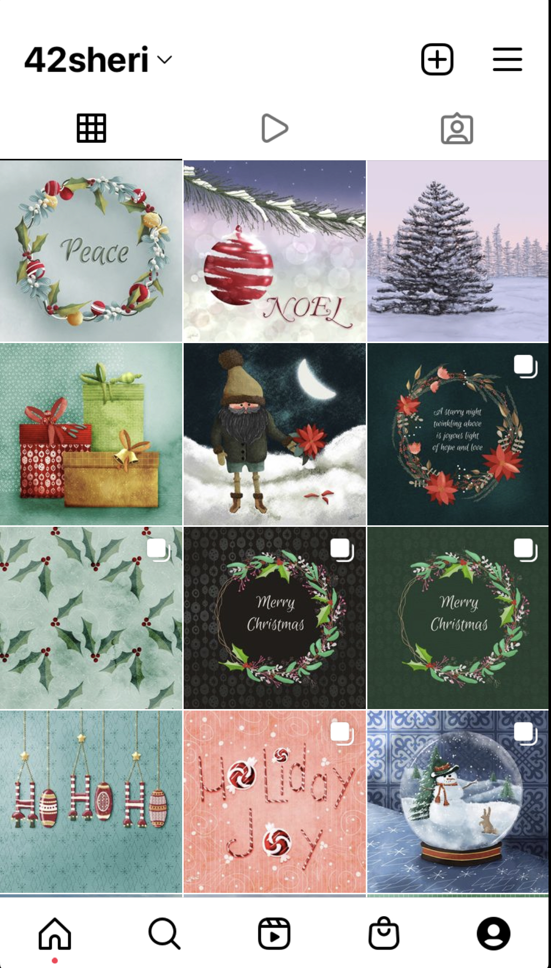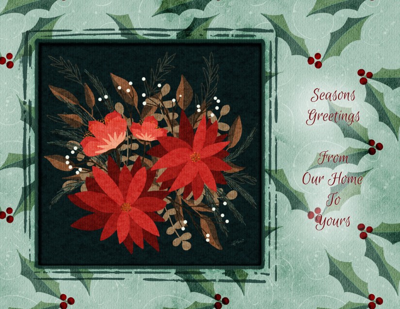 I decided to use my holiday images as post cards. But since my images are usually square, I created as one of my illustrations for prompts a pattern for holly– which I could piece together into a rectangle for a postcard template. To learn how to create a pattern, see the Spoonflower blog post featuring Jennifer Nichols who explains exactly how to create a pattern in Procreate: How To Create a Seamless Repeat in Procreate. You can do this!