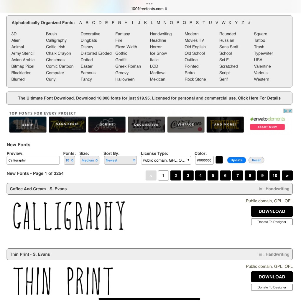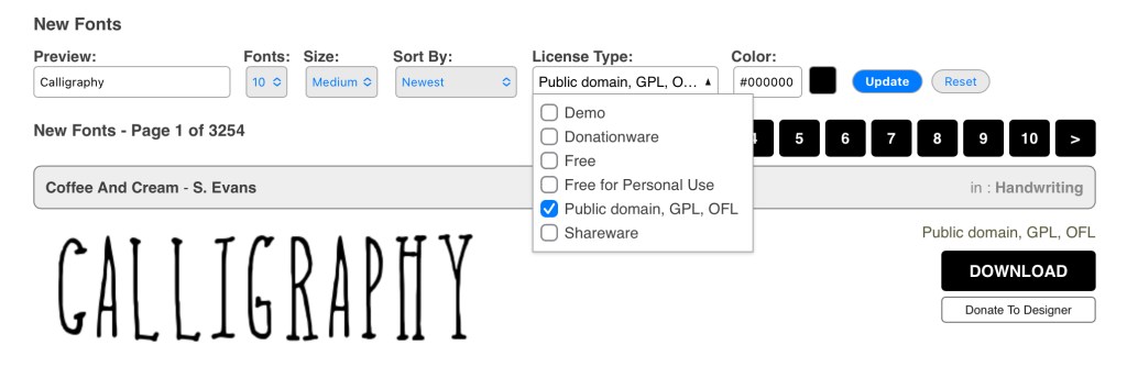 My techy husband warns me about sites like this font site– that sometimes viruses are spread in such downloads. I did connect with several others who use this site and I have not had any problems. They’ve been around since 1998, and I’ve seen the site on several lists of places to find fonts. [Example: ThoughtCo]. You can also search Google’s Fonts page: fonts.google.com and download.