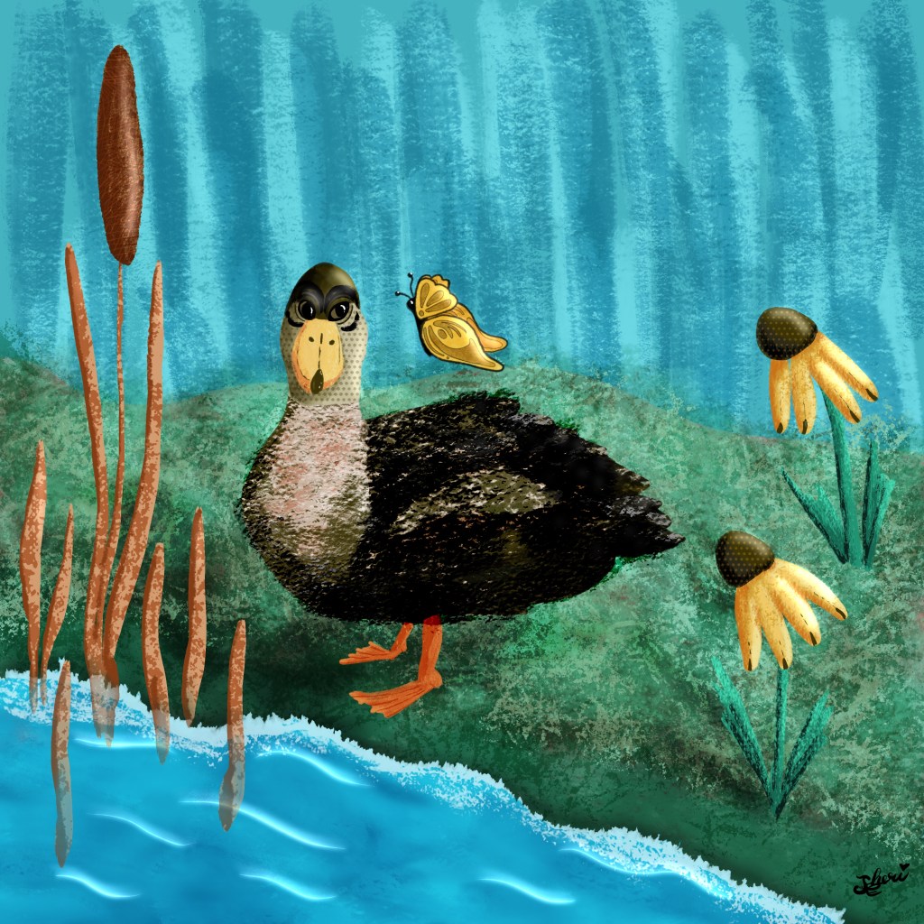I really wanted a duck with a dark head and yellow beak, because my butterfly theme continues from the woodland creatures to these farm creatures, and I thought the little butterfly might mistake a black-headed duck with a yellow beak as a coneflower! I found a real duck, the American Black Duck to use as my model. In Lisa’s Texturrific Shaders set is a brush called Roller Shader and a few others that, on a base color and layers create that mottled, feathery pattern. It didn’t take much time at all. And there’s a halftone brush [neck] in the Texture Maker set. Find Lisa’s brushes here.