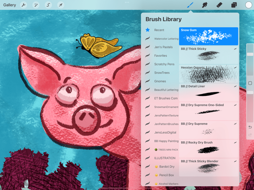 Still, I decided to try Google’s AutoDraw for help. And that’s how I found my sketch for the cow. I applied the gouache painterly effect on one layer as Lisa Bardot explains here: Gouache Ice Cream tutorial, but I used the Artist Pastel set with these ideas from her post about drawing a pig. Here’s a replay of my process: