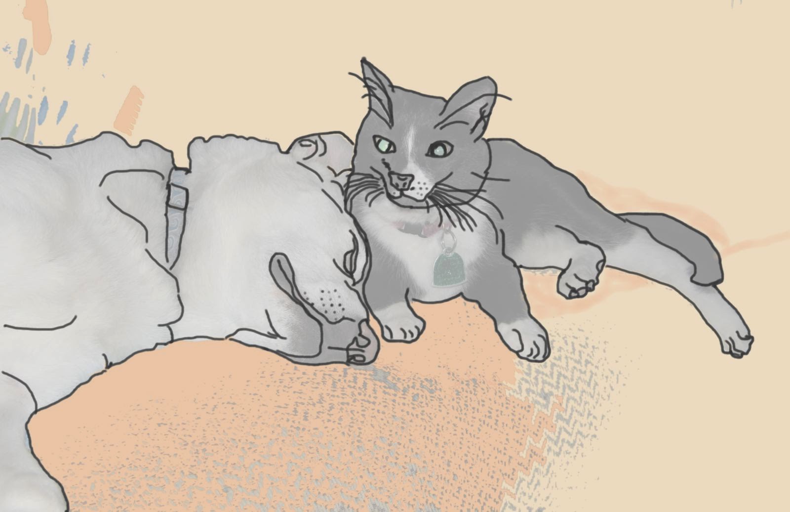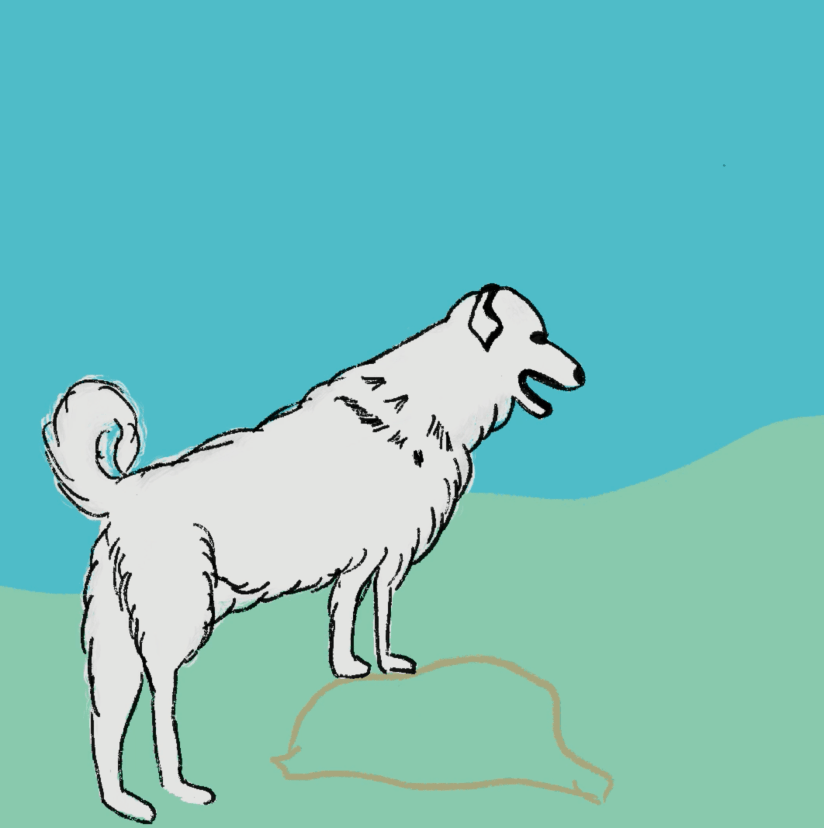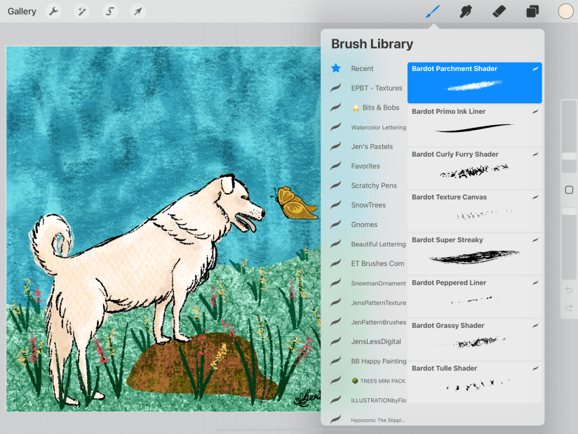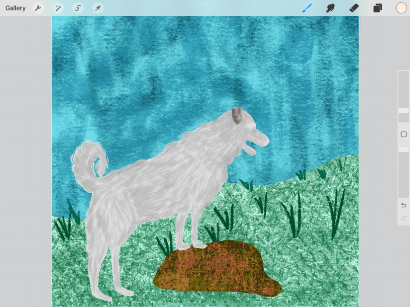 Finally, I just sketched in a scruffy outline and painted with Lisa Bardot’s Gouache Paintbox. Then I played around with her various Texture brushes [Maker, Liner, Shader], and Procreate’s Artist Crayon [rock] to get a look that at least stylized her white fur. Here’s some of the texture brushes applied:
