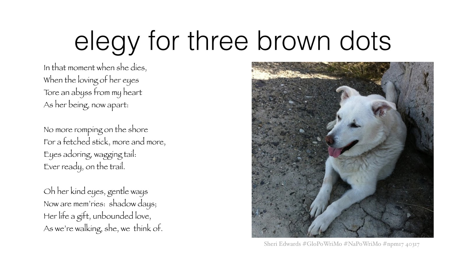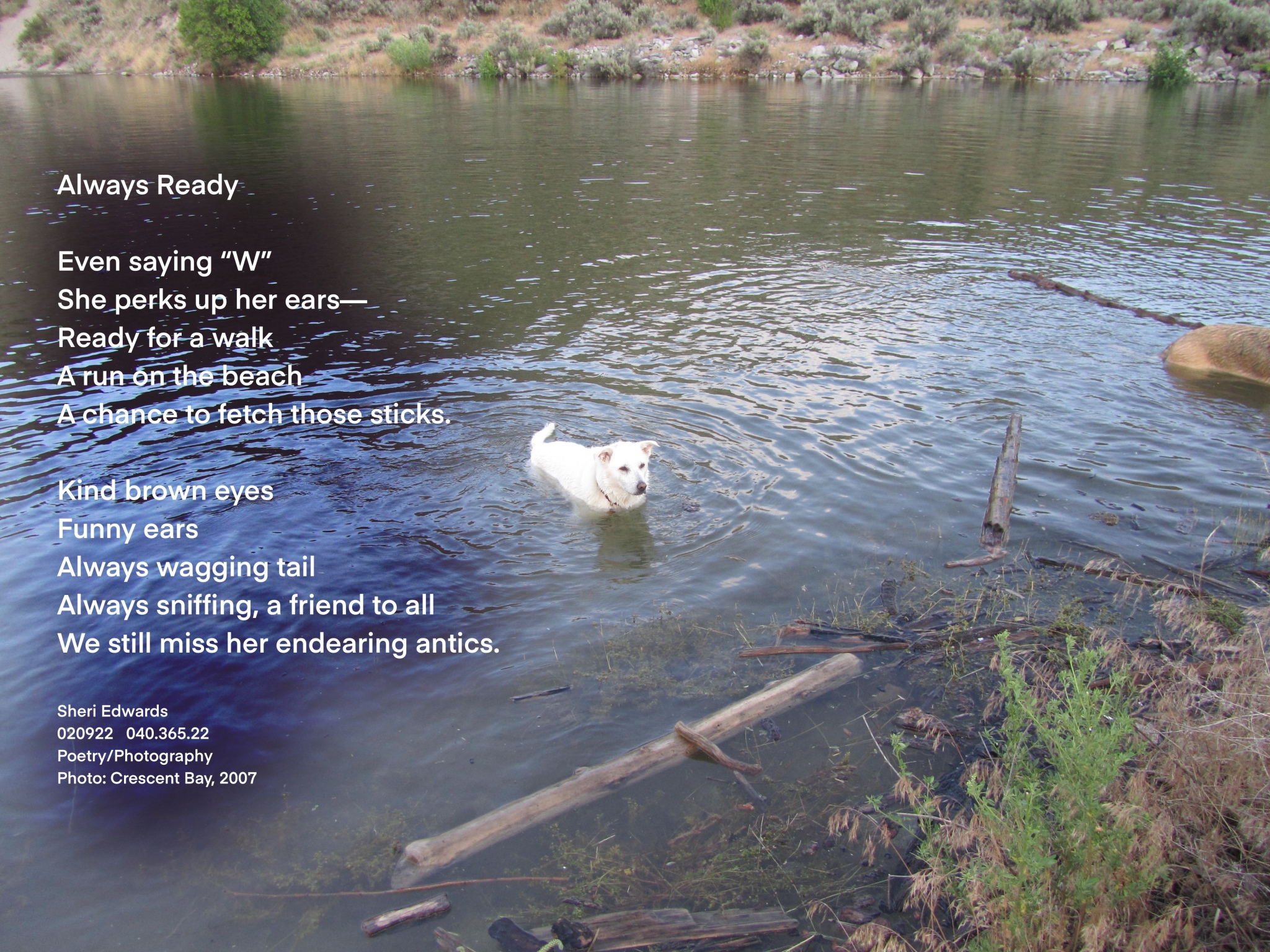 You see: a Resmut is a “reservation mutt.” She followed me around the schoolyard where I taught for thirty-one years, a public school on the Colville Reservation, and since she was abandoned and living on the playground, I brought her home for Father’s Day. She’s been our only dog and we miss her dearly.