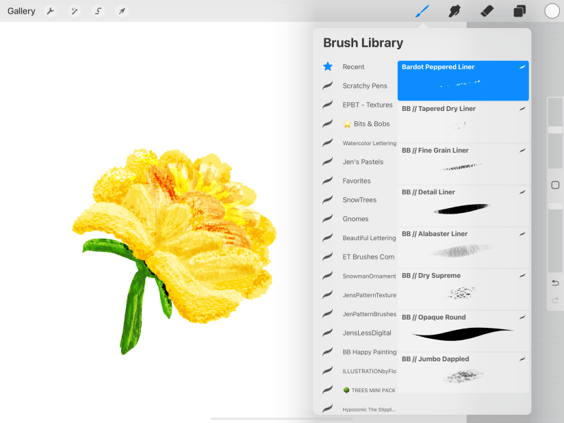 I chose to apply the brushes from Lisa Bardot’s Gouache Paintbox — color, shading, details and from Texture Maker- texture; Texture Liners-details/sketch. Gouache is more opaque and smooth than watercolor; I like that for digital and hand painting.