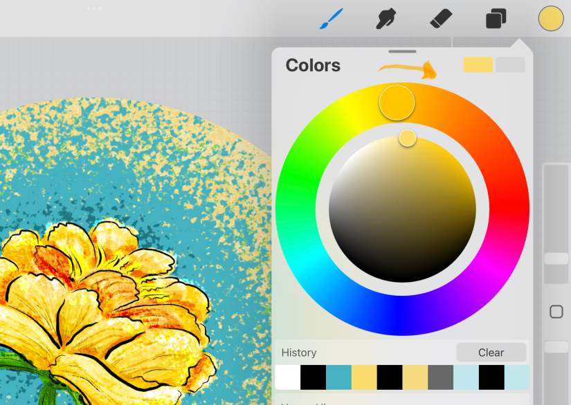 As you watch the replay, you’ll see only a slight difference in the chosen color because I did not want orange— I wanted yellow. I still don’t have a solution for choosing the foreground/background petal colors, but my solution was to add in the yellow orange through clipped layer texturing. You’ll see me adding more layers to darken areas, trying to get the shadows that differentiate the petal placement.