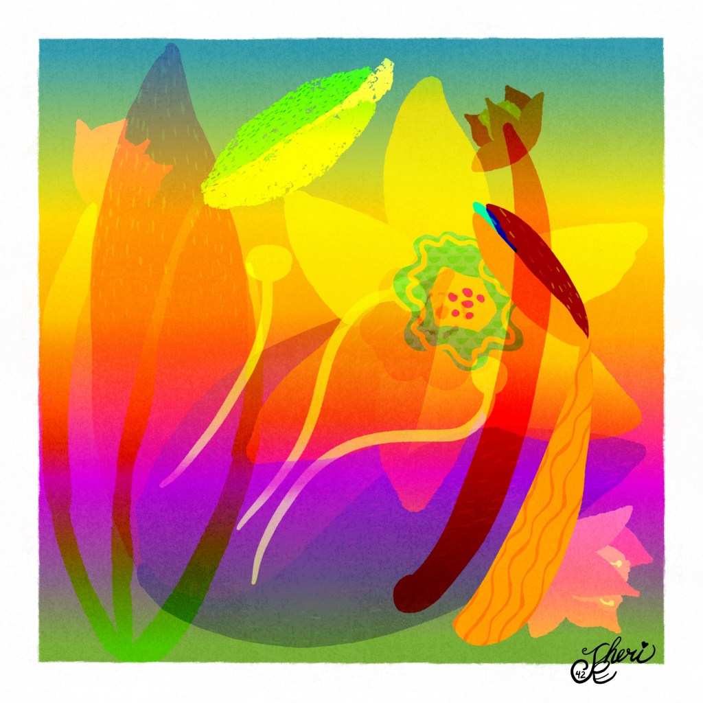 For this style, I knew I wouldn’t be “cubing,” but would be abstracting the shapes. So I started with breaking down the parts of a daffodil and then drawing those parts which I could then color and arrange.