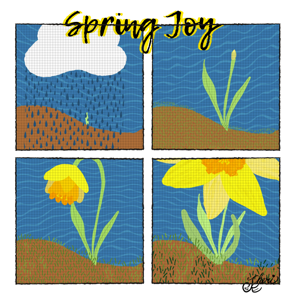 For the pop art / comic style I created four blocks for a daffodil story: sprout, bud, opening, and opened. I should have applied a more brilliant background and started with larger daffodil elements. I finally realized that and made the three daffodils larger, as you may see in the replay below.