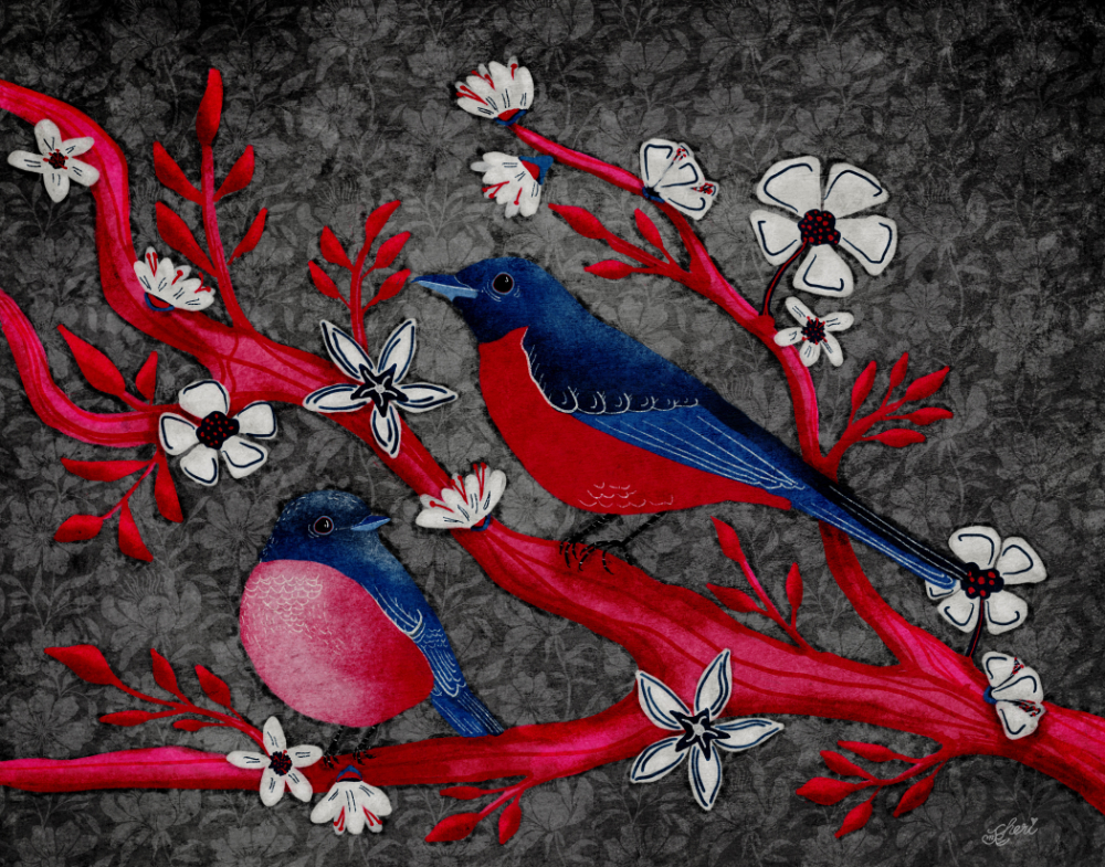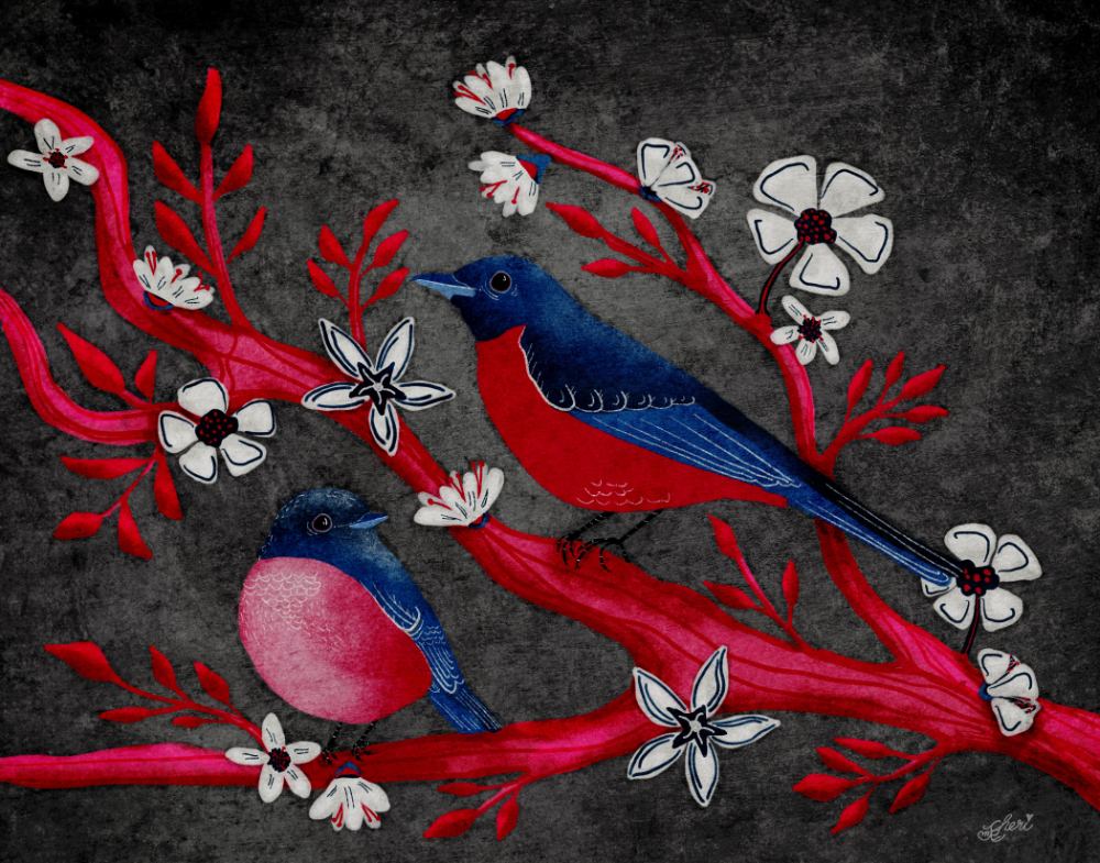 Each Wednesday check this blog for a strategy, process, or reflection for illustration with the iPad app ProCreate. This Wednesday Wrap Up is a wrap up of a project from a Jennifer Nichols class using an Este Macleod palette: Summer Birds: Folk Art: blue red-breasted birds on red branches with white and blue flowers