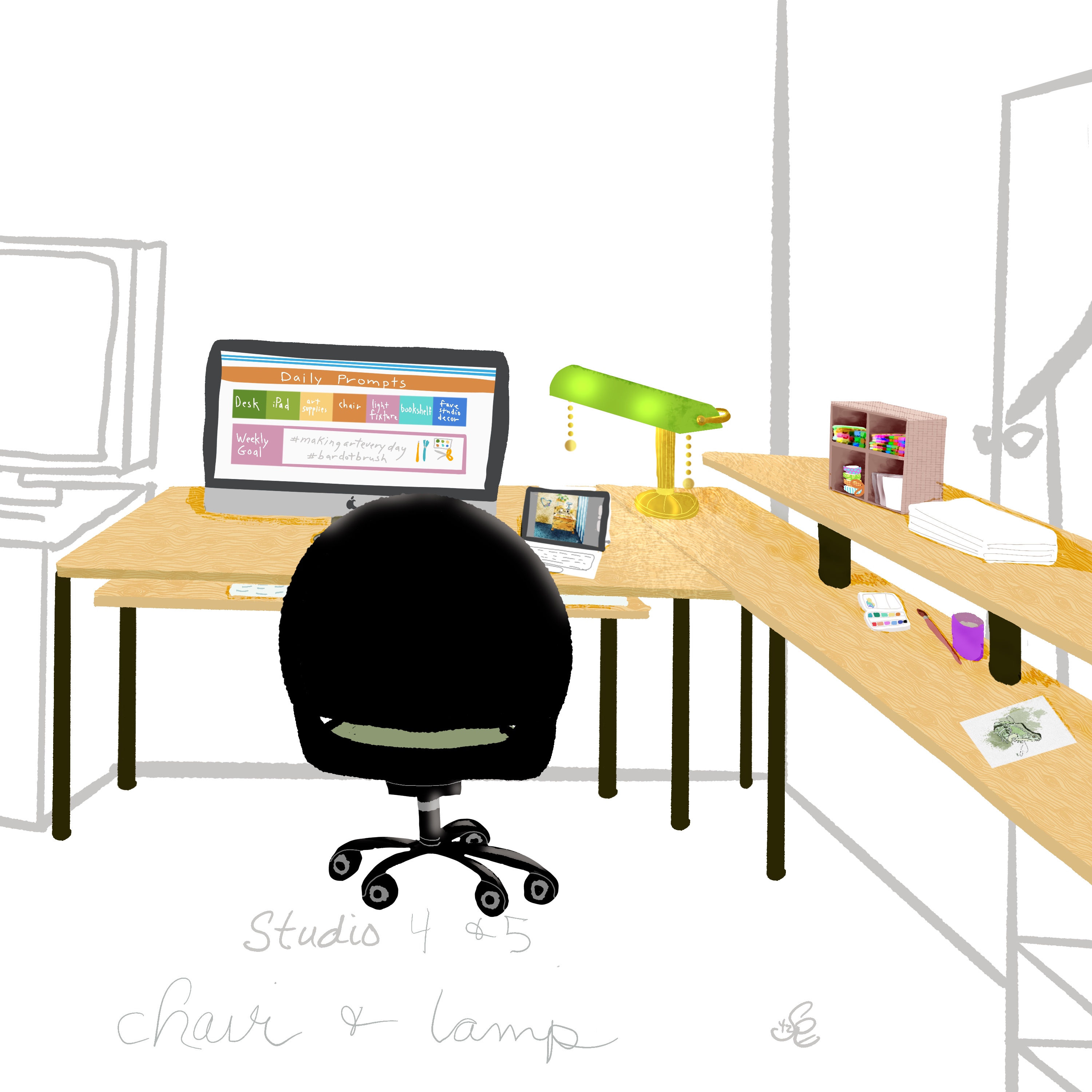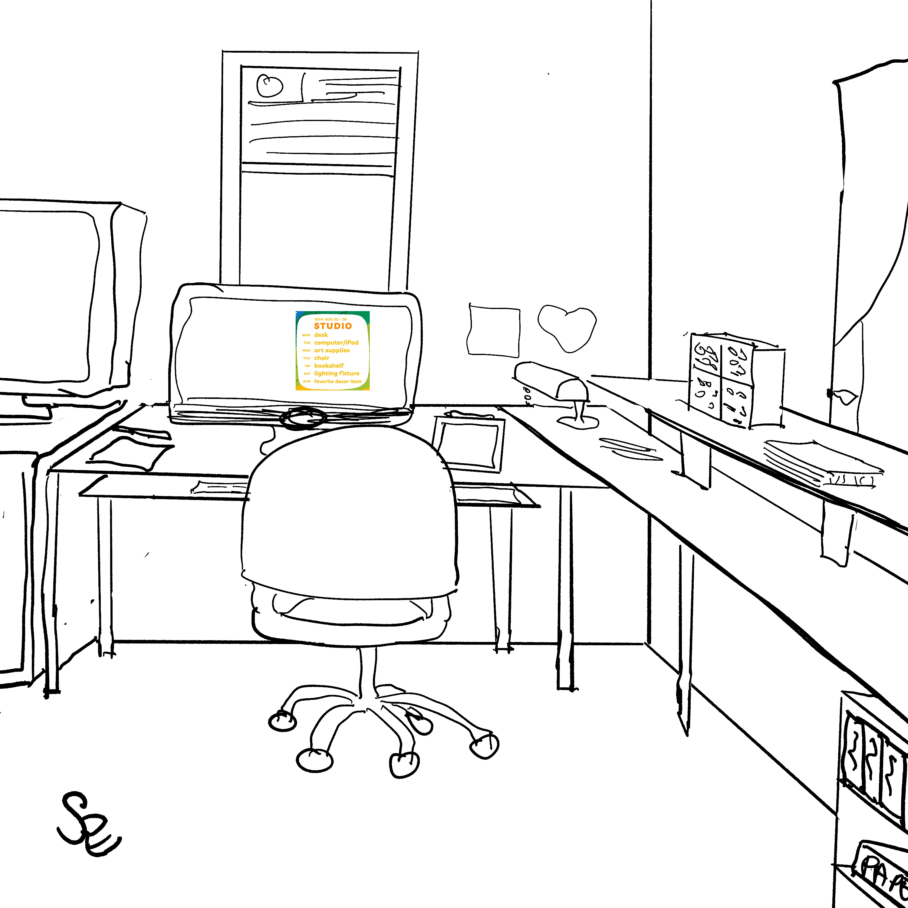 The weekly theme #34 is “Studio” and the daily prompts are desk, computer/iPad, art supplies, chair, light fixture, bookshelf, and favorite decor. The prompt offered many ways to approach this: a fantasy studio, one we’d love to have, our own art studio, the couch. LOL. I approached the big picture with trying the perspective thing again to draw my actual work area to include those individual items. Most of those I drew in my sketch for the first day, Monday, seen above. On Tuesday, I added the desk and computer/iPad. On Wednesday I added in the art supplies.