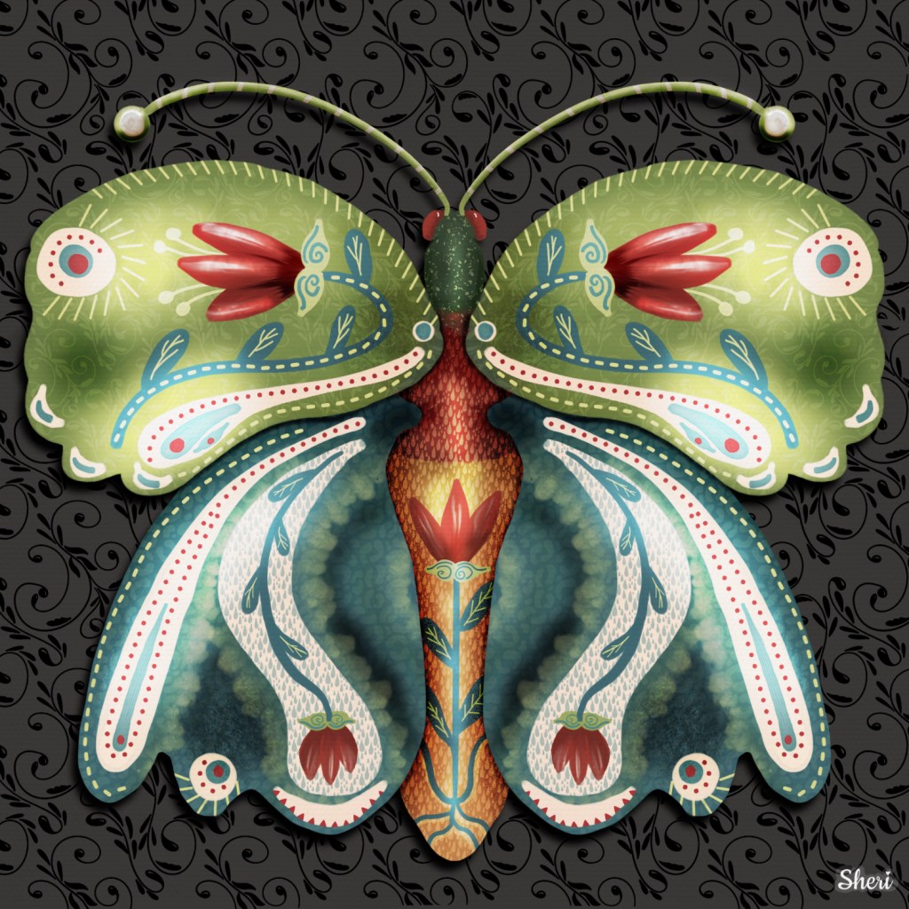 I focused on what was bothering me most about my designs, and then I realized it was the flatness of bugs. So I began to create a bit of dimension with a little trick I learned quite a while ago and from several different teachers. I added a clipping mask to the area I wanted to round out with dimension. I set the blend mode to “overlay.” On that layer with black and a pastel, textured brush, I added a stroke where shadows might be. On the same layer in white, I added a stroke where highlights might be. Then, I blurred, just two percent, and right before my eyes: a rounded body or leg or flower that pops with dimensional illusion! I went a bit overboard with this one– so much that some don’t see it as a moth, and some see it as metalic. But I do like it:
