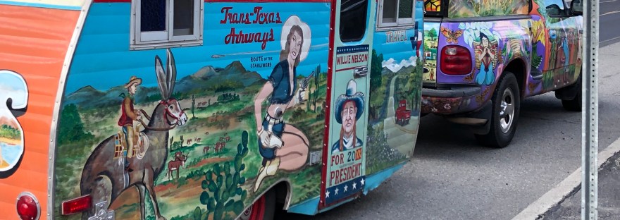 Many years ago this lovely and colorful rig could be seen a mile away while driving down the road. Fortunately, it stopped and we could get a close up view of its artistry. We asked permission to photograph it from the traveler. I still like its colorful presence. So, I think this traveler DRIVES his “journey stick.”