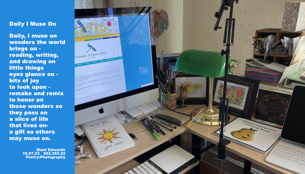 Every day, a photograph, a poem. Every day, in my “office / art studio,” I imagine, I read, I write, I draw, I wonder about the world and how to both scatter seeds of kindness and understand the chaos that is today. I am not understanding the hate in the hearts of so many– to control instead of to “Live and let live.”