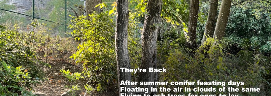 They’re out– wherever we walk we’re swatting away the clouds of gnats that hover together in swarms. What they are — aphids: smoky-winged ash aphids or also called blue ash aphids. Yesterday, a few. Today, thousands and thousands.