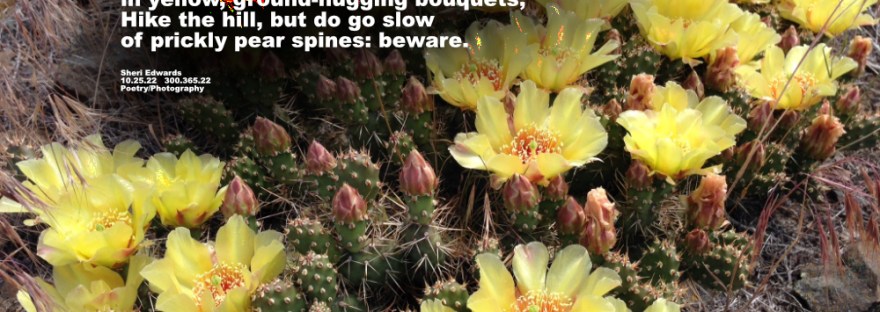 Every day, a photograph, a poem. In late May and June the prickly pear cactus bloom in these lovely bouquets that one dares not touch. If you do, the little “buds”– the fruit part just fall off– with the spine stuck in your finger! Ouch! Still– they are lovely, and supposedly edible, but if you read this article— it’s a whole lot of work! It’s official name is Opuntia fragilis in our area. Here’s a map of where you can find it.