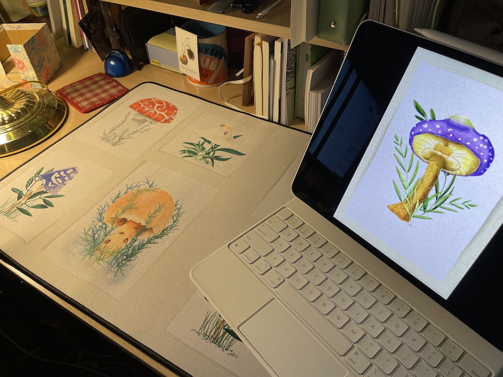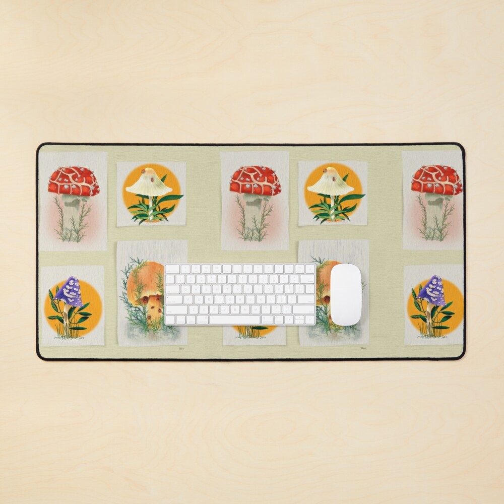 The watercolor is more gouache-like, which helps because it’s not quite as transparent when coloring. It’s a bit tricky for me to get the colors to not overlap and blend. Also, when I first completed the watercolor section and uploaded to Red Bubble, I purchased the desk mat. As you can see– the tan mushroom did not show up very well.
