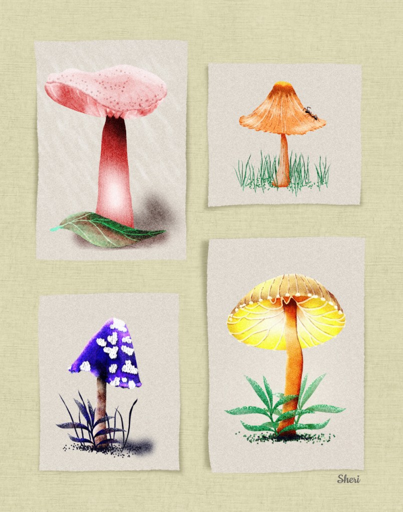 I chose to create a four projects of four mushrooms each, one set for each of the styles. That gave me a bit of practice drawing and sketching mushrooms as well as use the brushes. You can see the results in the gallery above with links to a framed picture of each on my shop Sheri42 Red Bubble.