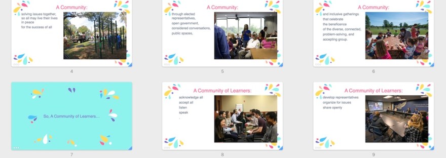 So I spent time on a slideshow that allowed me to choose a nice template and insert photos from the web to match the ideas I have, and we once all seemed to have, about community. And I added a bit about how that translates into education for learning communities.