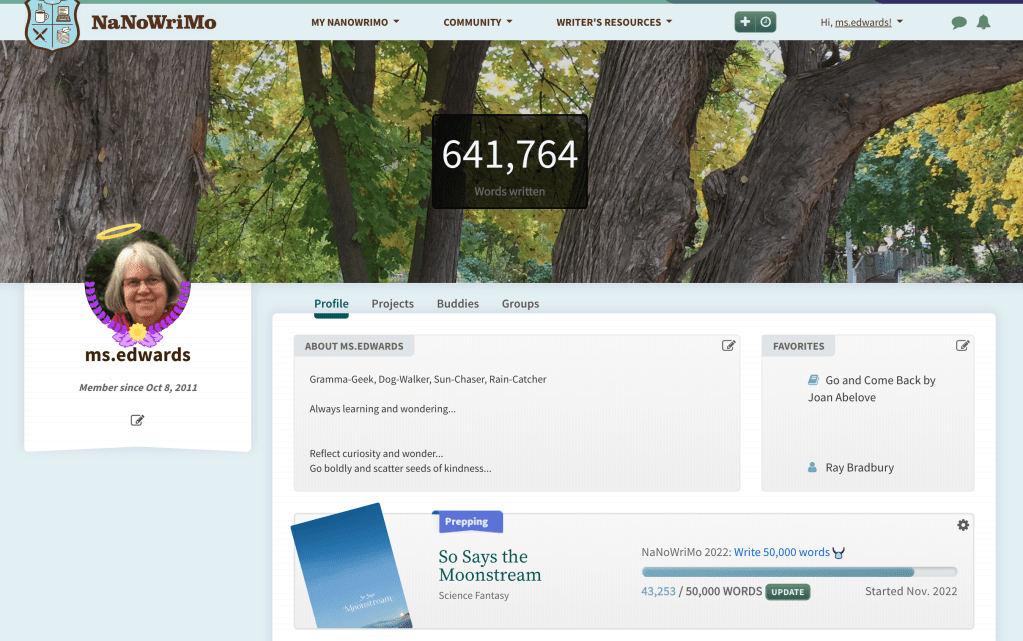 Since 2011 I’ve been writing 50,000 words of a novel each November for NaNoWriMo [National Novel Writing Month]. Since 2011 until this very day, the 19th of November at 4:15 PM, I’ve recorded 641,764 total words. That’s a lot of words. Profiles are private so I grabbed a screenshot of my profile just now.