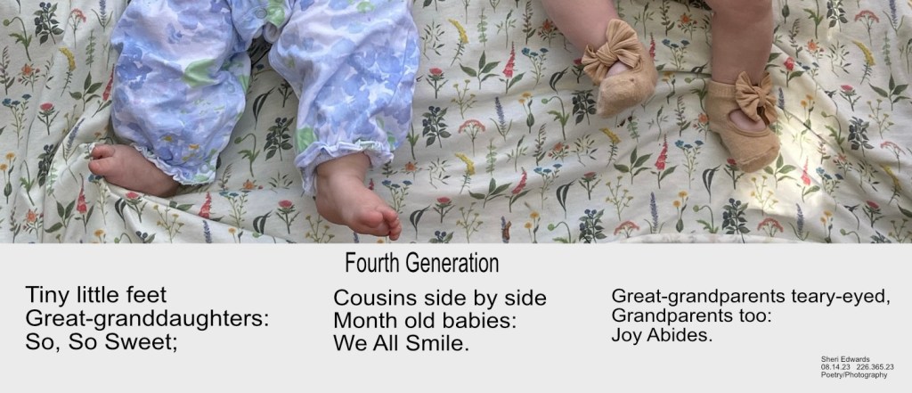 Every day, a photograph, a poem. This weekend I had the joy of holding in my arms two great-granddaughters, two and three-months old! Precious are these little ones, now fourth generation of our families. Many of our whole family were able to join in, sitting in the shade of Autumn and Rob’s lovely old tree, relaxing in conversation and switching armfuls of babies as four-year old Elijah celebrated his fourth birthday.