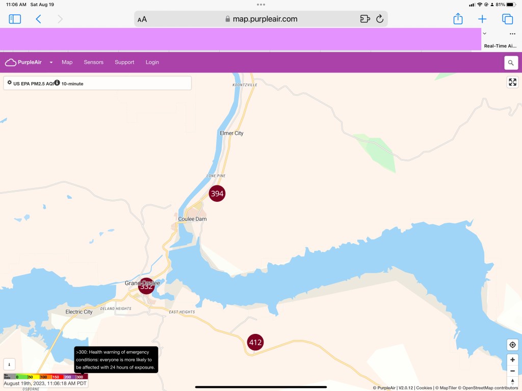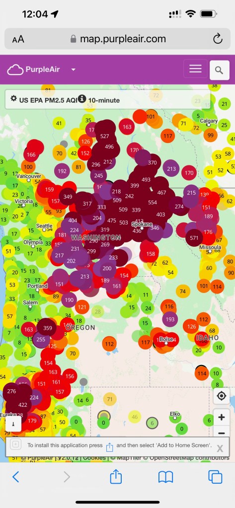 Sometimes we drive to fresh air, but currently, the air is smoke-filled for hundreds of miles. We’re also fighting fires directly around us, which are all contained. But Eastern Washington in general is under siege.