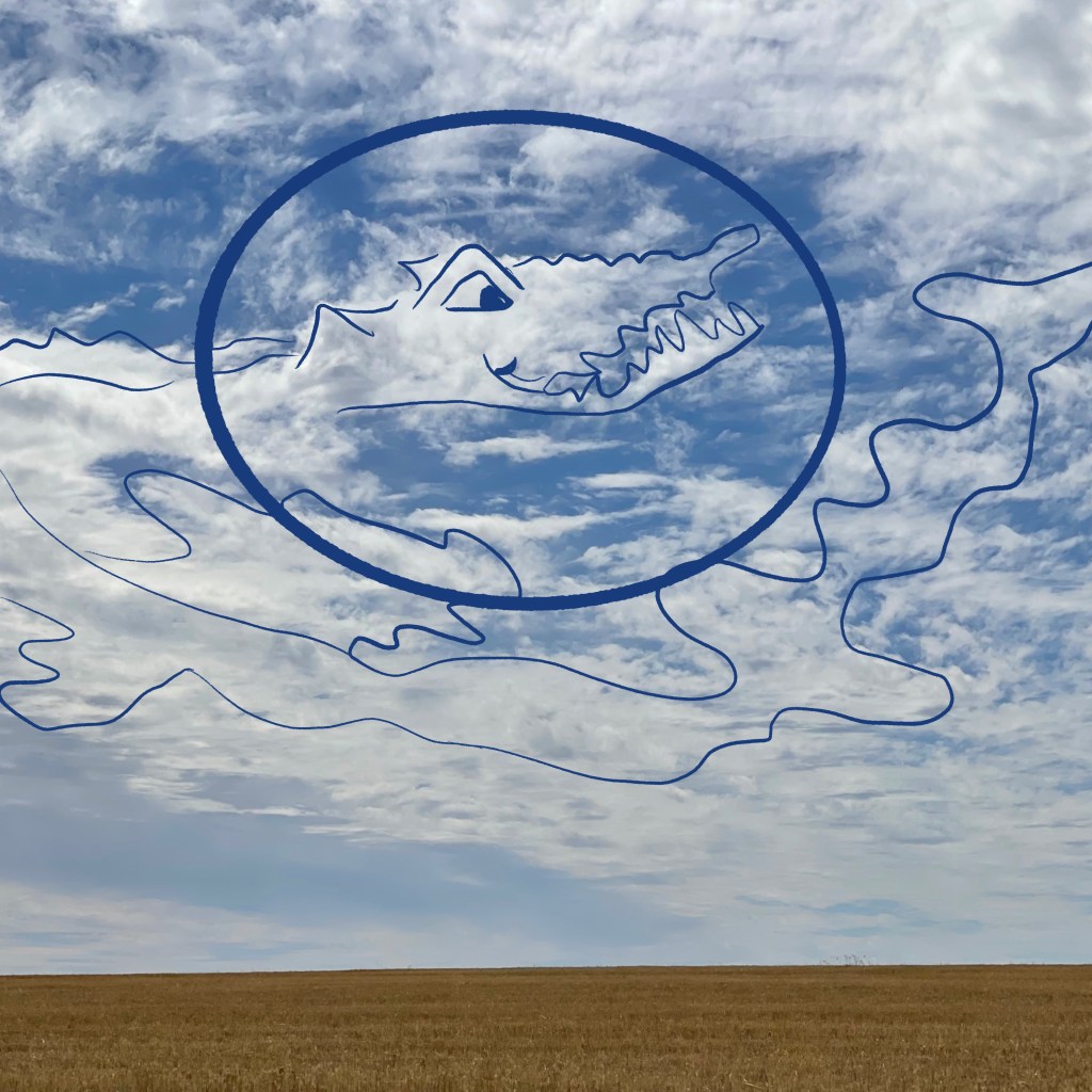 Every day, a photograph, a poem. Today, Scott drove me to the eye doctor in Davenport. As we drove away from home around the hillside I looked up to see a plop, plop, plop of clouds in row. I said, “Look: dragon cloud poop.”