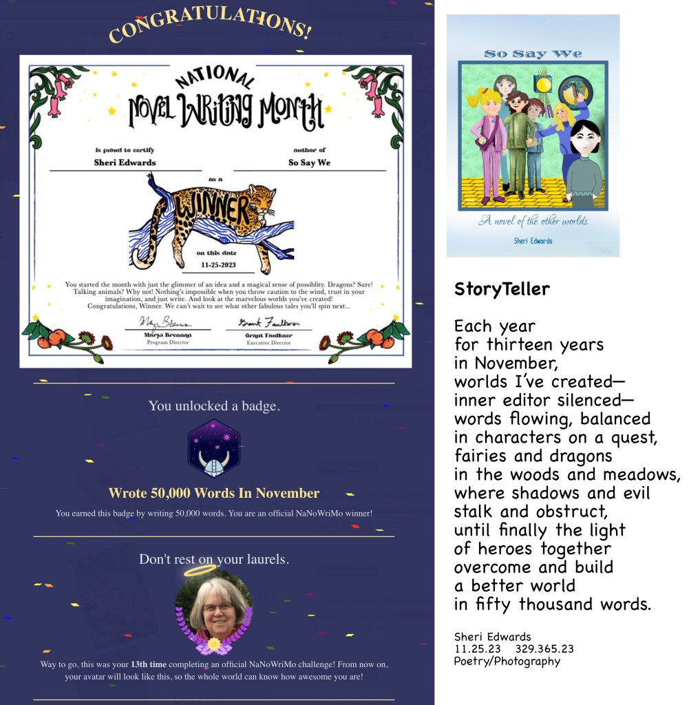 My November writing — a poem a day plus writing 1667 words every day for NaNoWriMo [National Novel Writing Month–for more information see my post: I Write] has been successful. It’s magical to allow your words to flow without an inner editor stopping every few seconds to correct a comma or debate a word with your self. Just write the story. Get it out the imagination.
