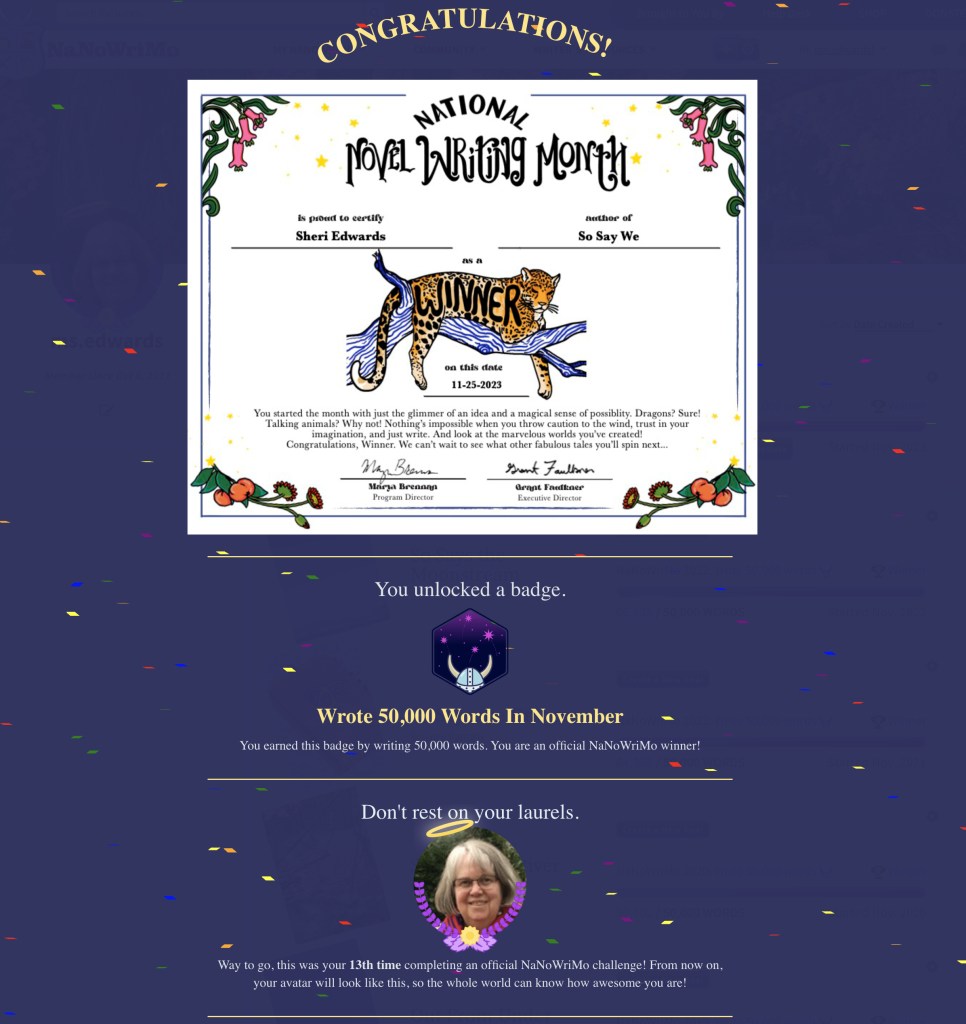 This is my thirteenth successful year of NaNoWriMo, and this year and the last three are a continuation of the same novel — rough, really rough draft though, since the inner editor for each was silenced in order to get the storyline written. My “winner” page at NaNoWriMo: