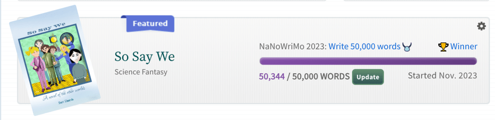 And I have finished today: 50,000 words done! A Winner of NaNoWriMo 2023! Hooray. The story is almost finished– the portal will soon be closed and Walter and Sandra… will they be saved?