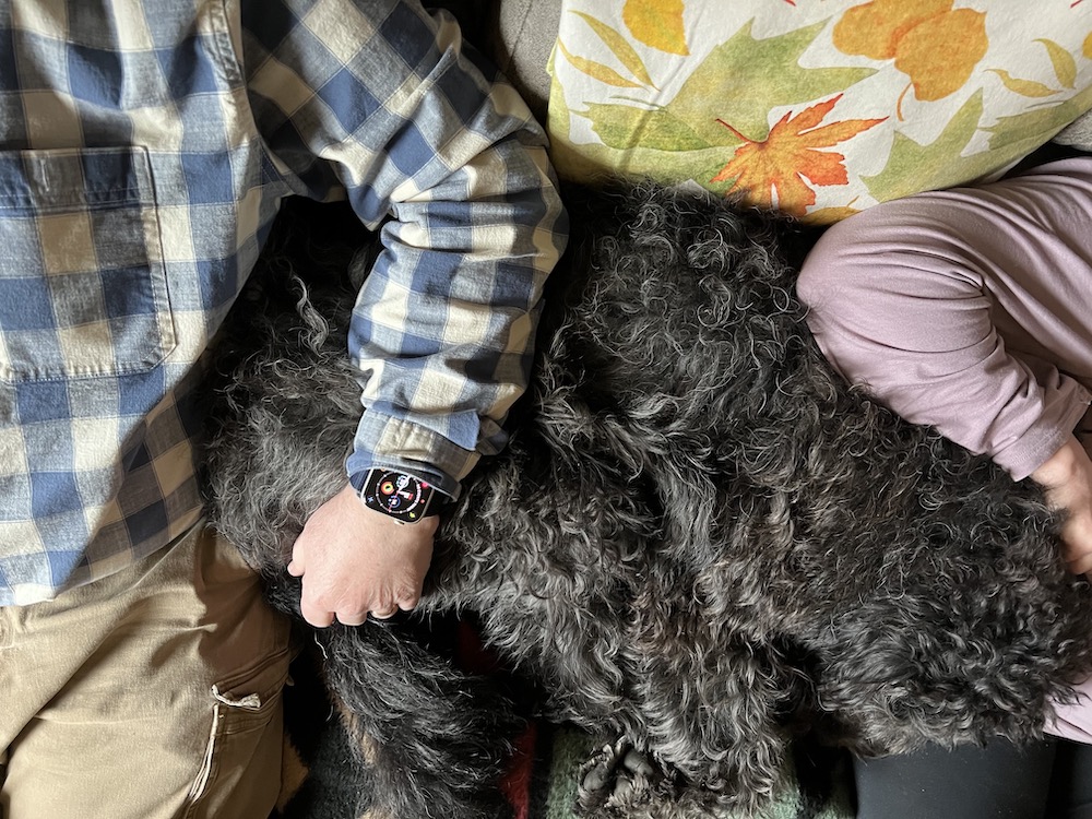 Or their small moments, like this — a photo my husband snapped this morning. A small moment, a little thing. Scott, the dog, and me. And both of us with our arms on the dog. Scott said, “We don’t have armchairs, we have an armdog.” Of course, it went on our family chat. LOL. And the point is that we noticed and we shared and we are grateful.