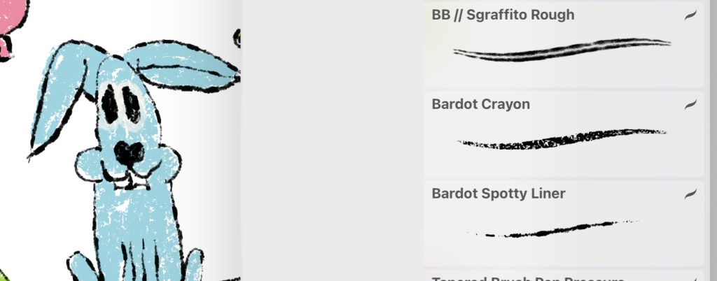I used some fun brushes this time from Lisa Bardot— a messy brush, spotty liner, for outlining and a texture brush, crayon, for filling in. The Bardot Spotty Liner is in the Texturrific Liner set. Bardot Crayon is in the MidCentury set. Sgraffito Rough is in the Scratch Art set.