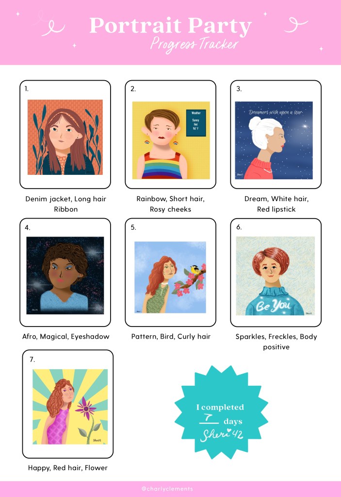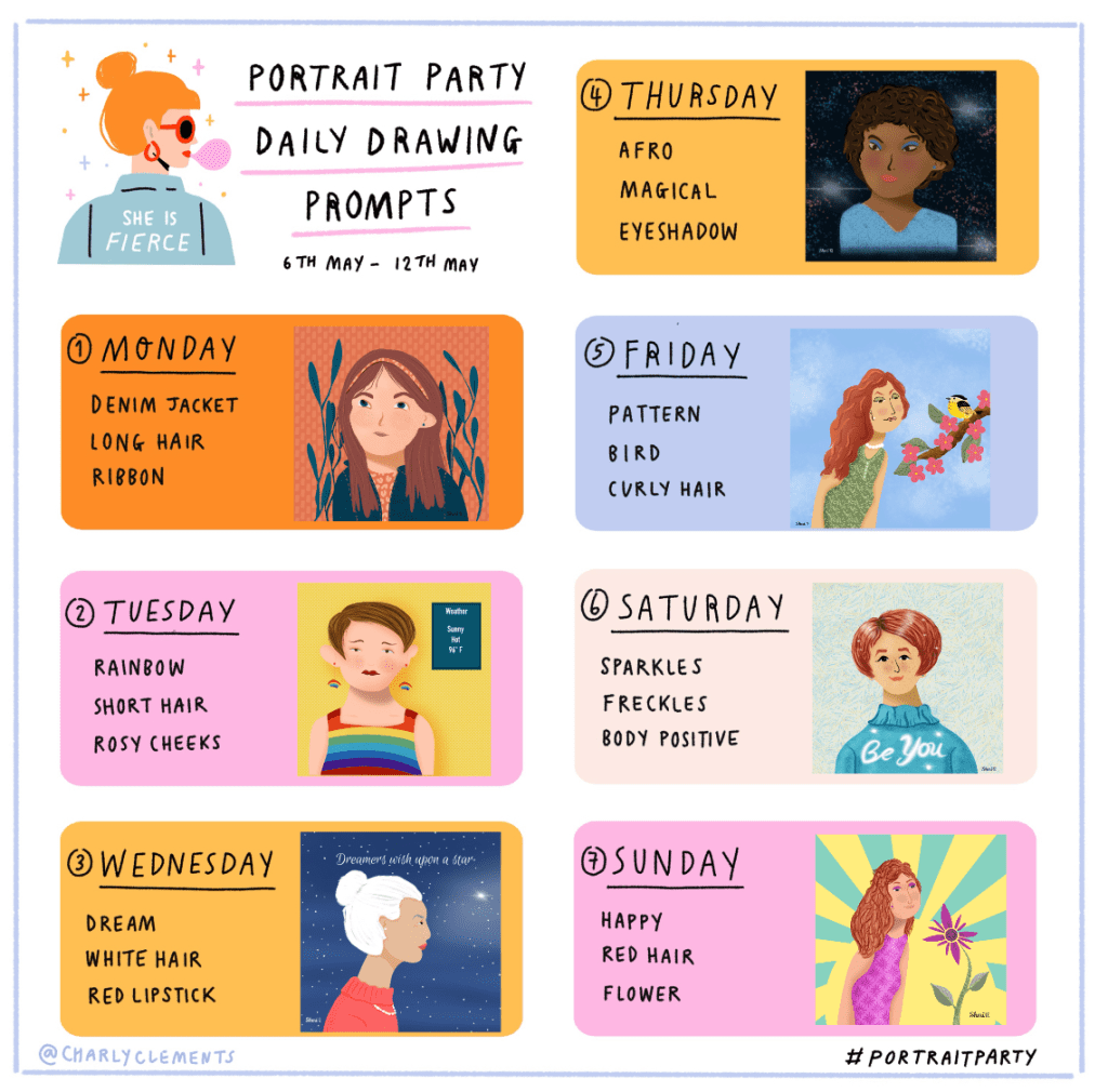 Charly Clements is once again sharing a “Fun with Faces” challenge she now calls “Portrait Party.” Draw portraits every day for a week, each day with three items to include. Tag with #portraitparty & #charlyclements and tag @charlyclements . Today’s prompt: happy, red hair, flower.