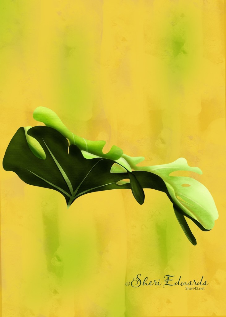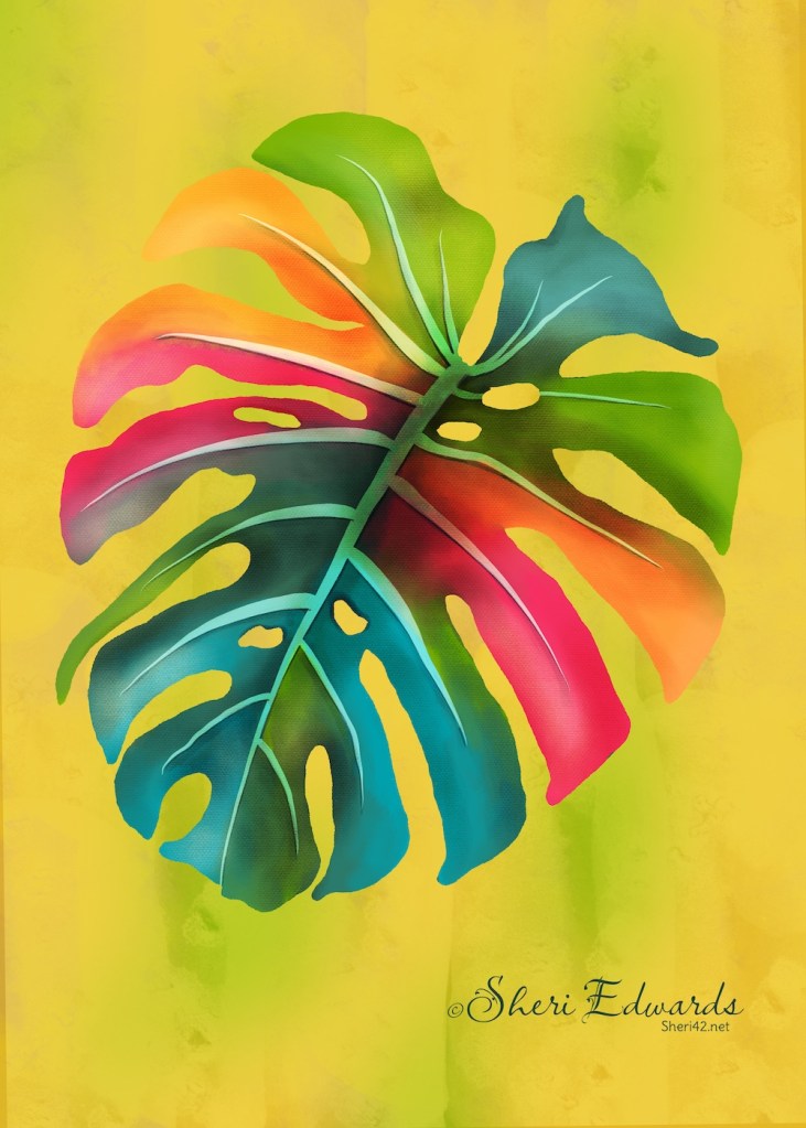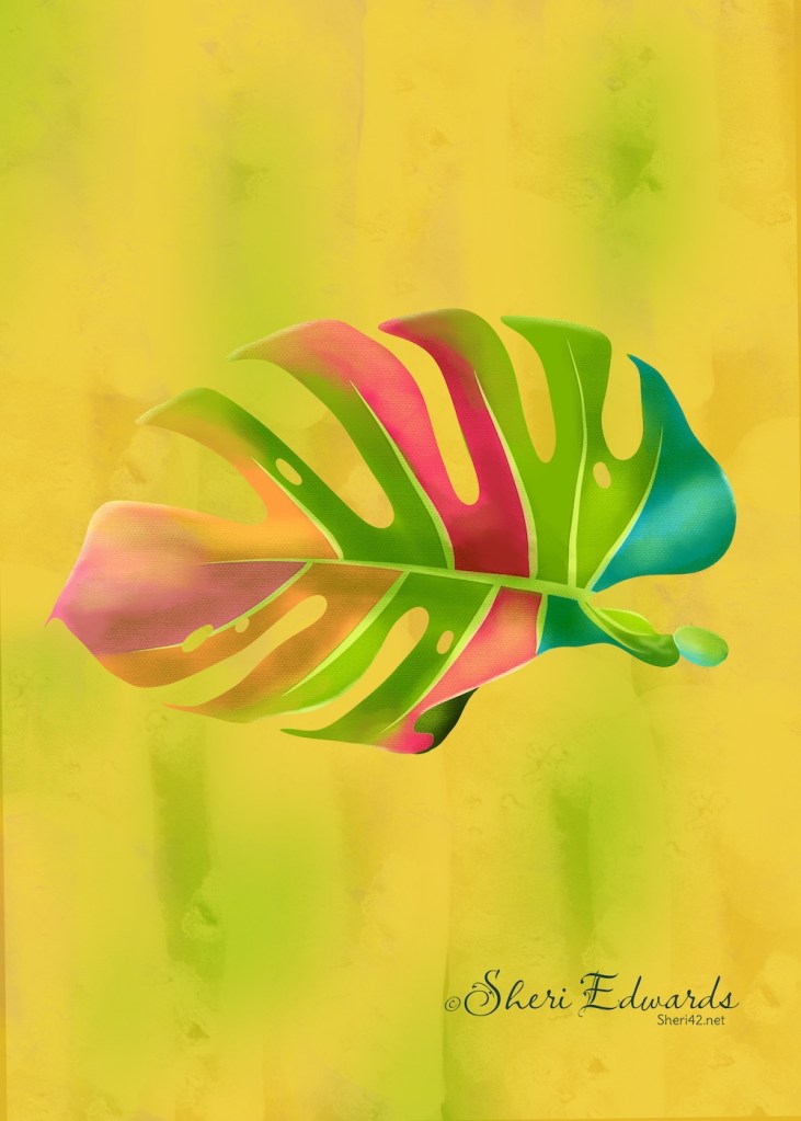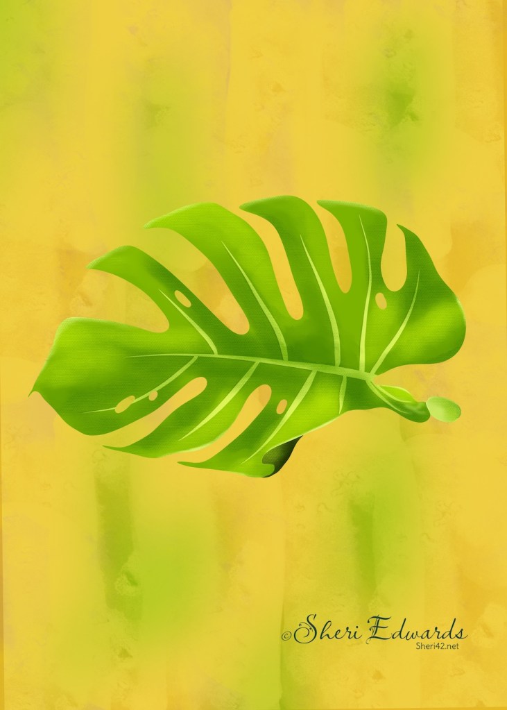 Every week in CatCoq’s newsletter, she suggests a challenge. Last week it was to draw a monstera leaf, encouraging us to get creative with colors. She provides a blog post for drawing monstera in Procreate: Textured Monstera. For a busy Monday, I decided to give it a try.