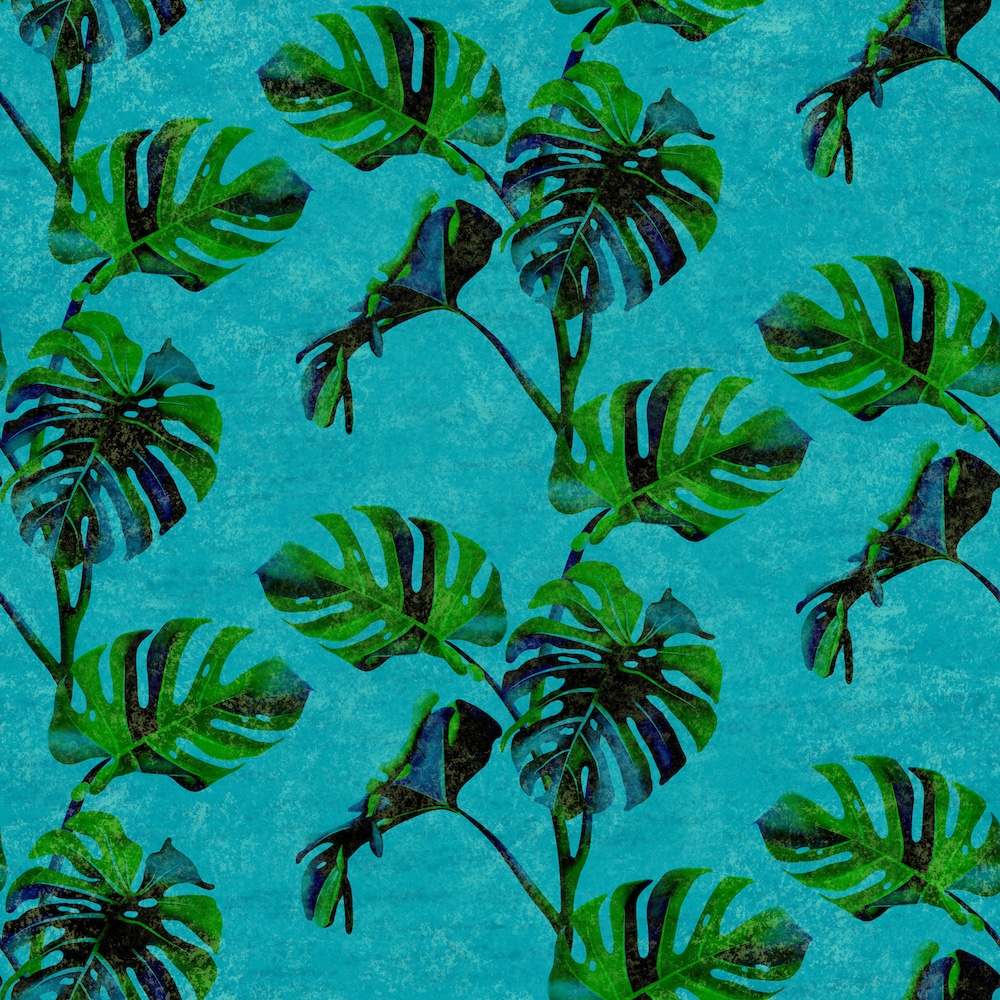 As you can see, I did get creative with the palette she provided as well as create leaves in green hues. I decided to create a pattern with the colored leaves. I plan to add a bird or two in the pattern at a later date. The blue monstera pattern is the colored version set to color burn.