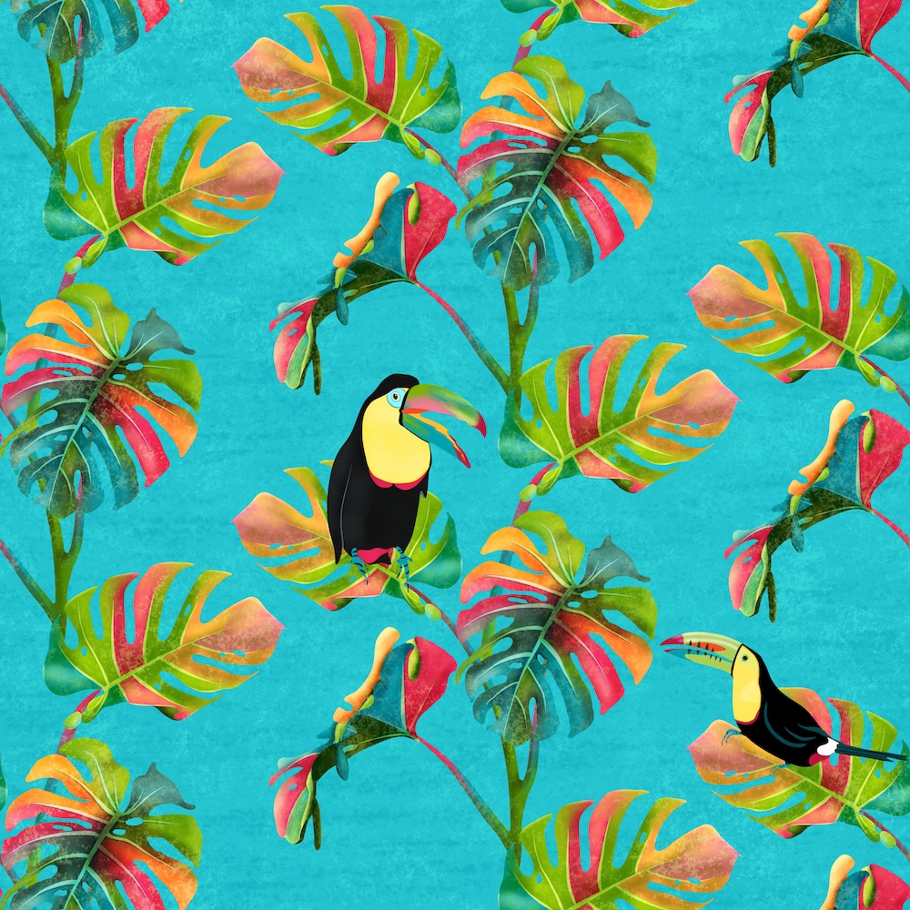 monstera leaf pattern using Procreate; adding a toucan; experimenting with colors and textures in a drop pattern