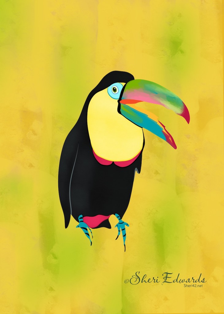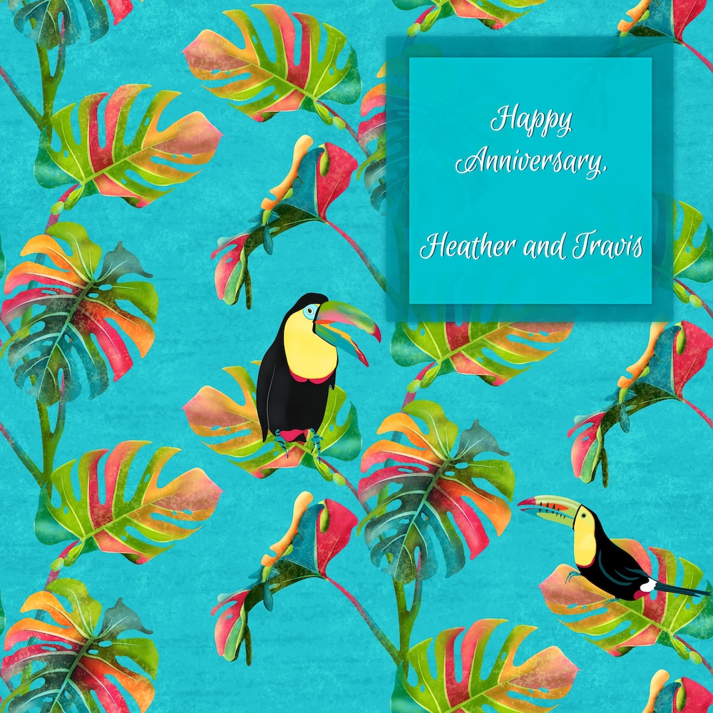Every week in CatCoq’s newsletter, she suggests a challenge. Last week it was to draw a monstera leaf, encouraging us to get creative with colors. She provides a blog post for drawing monstera in Procreate: Textured Monstera. I took the plunge yesterday [Monstera Challenge], Monday, and am adding a toucan today, which I decided yesterday. I also created an anniversary card for our daughter for tomorrow.