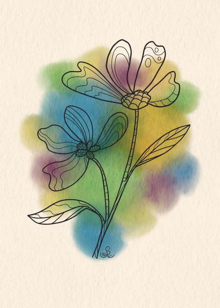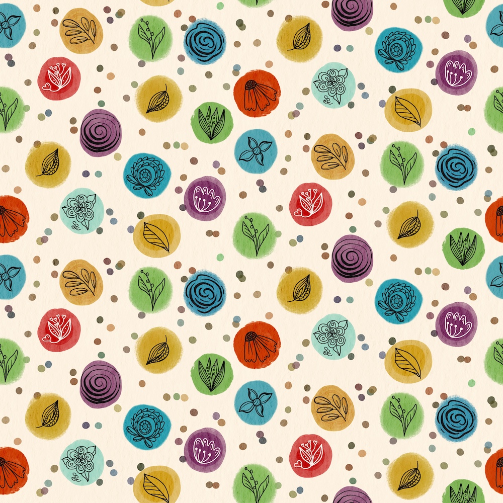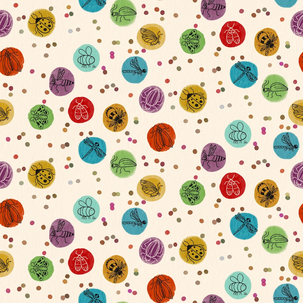 Another community I love is Creative Journey with Jennifer Nichols. This week I enjoyed the relaxing style of watercolor and ink from a short class with brushes in Jenn’s community. She also provides a repeat pattern texture canvas which you can see in the illustrations below. I created hero and secondary patterns for florals and bugs: