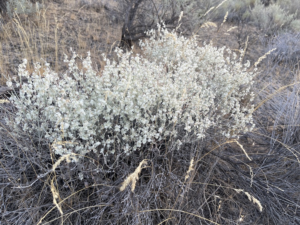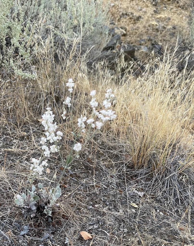 Up ahead in an open space among the sagebrush and rabbitbrush we saw what looked like a clump of snow. Of course in this 90° F heat, it was not. It was the delicate flowering of snow buckwheat, Eriogonum niveum.
