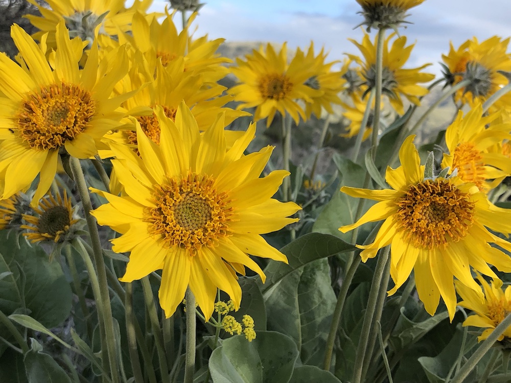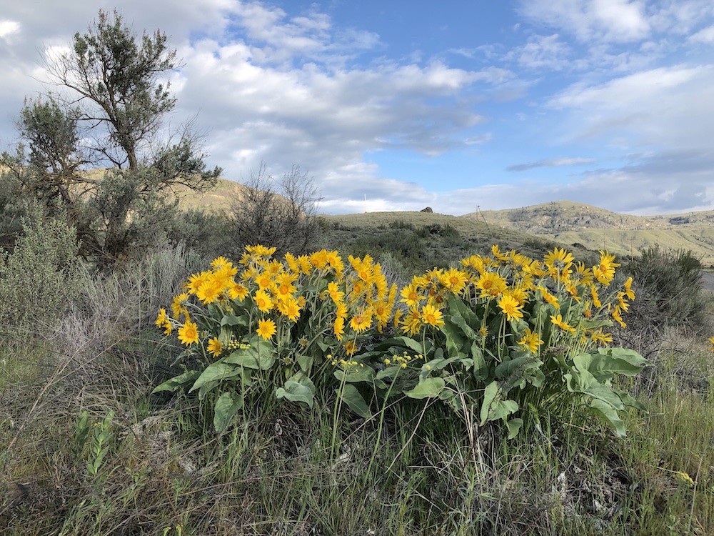 I love the arrowleaf balsamroot [Balsamorhiza sagittata] of the Astor family which grows in our shrub-steppe area; it’s one of the most important wildflowers because of its deep cultural significance to the Native Americans here. These large, bright yellow sunflowers bloom from April/May to July.